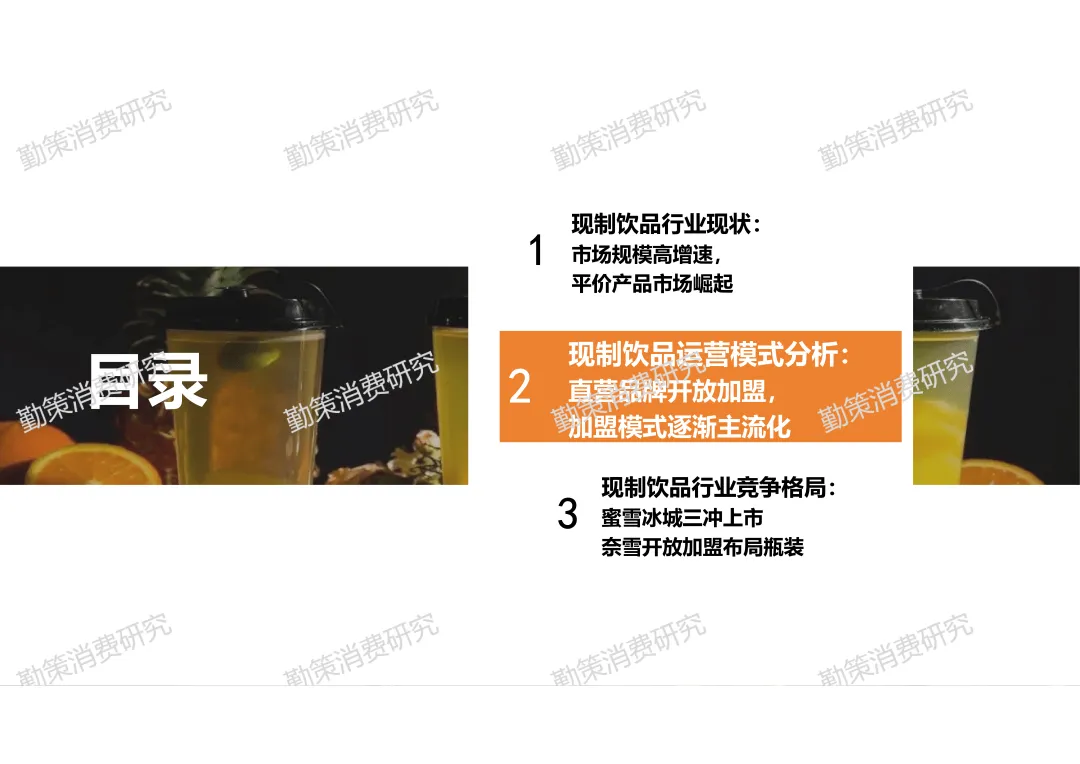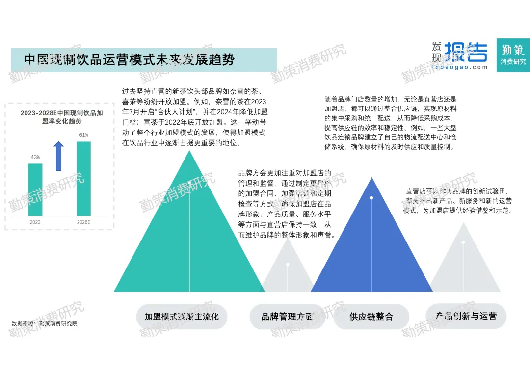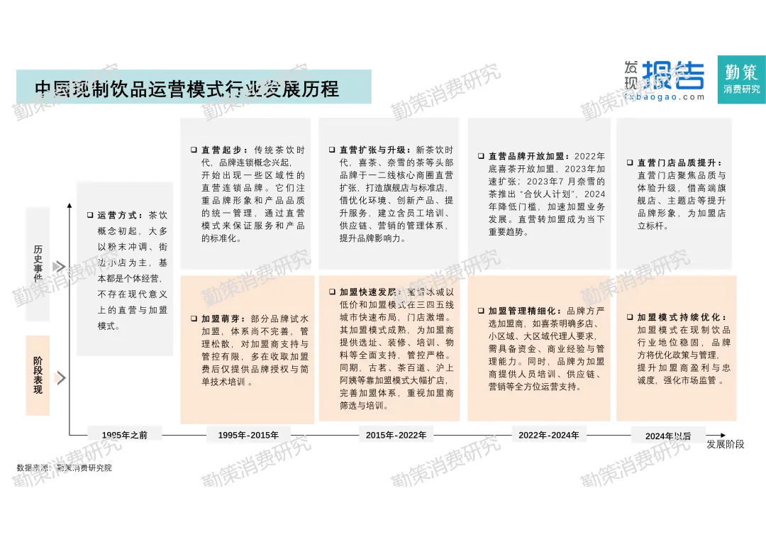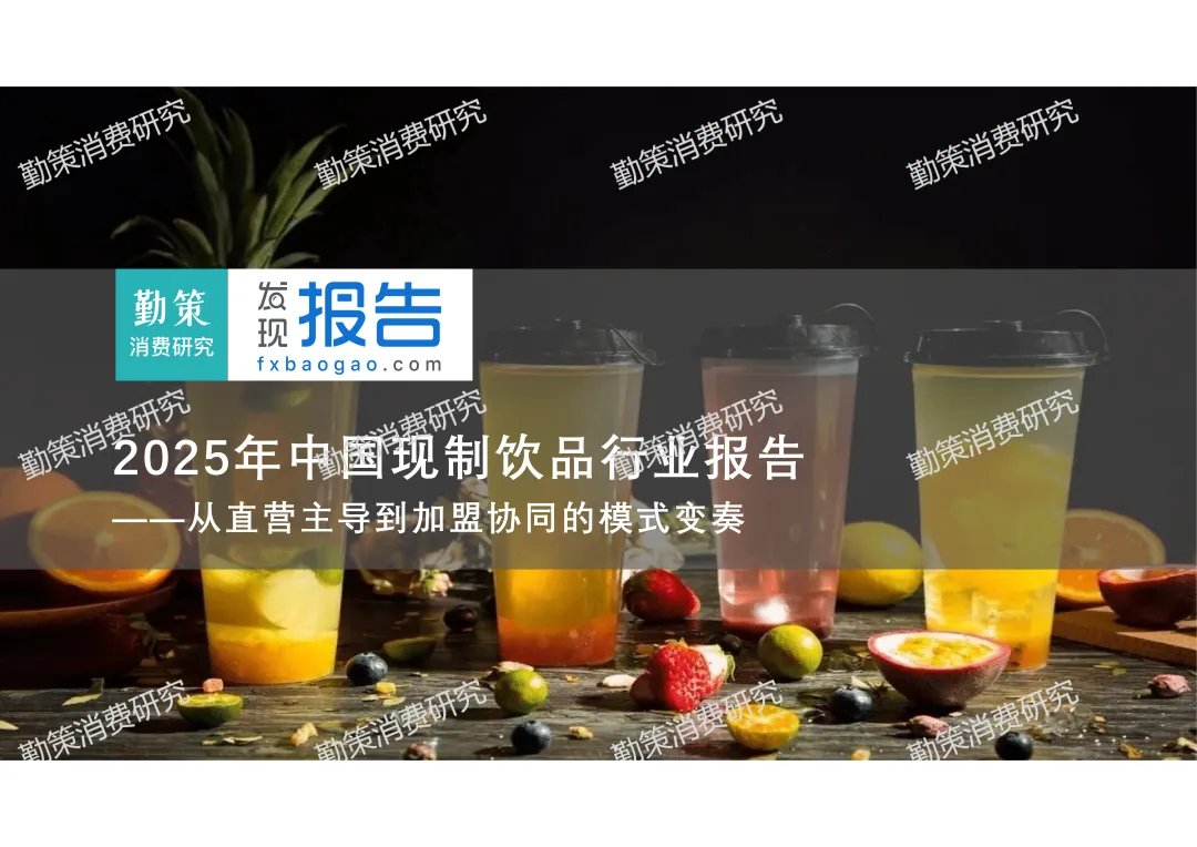 本报告由勤策消费研究发布,聚焦中国现制饮品行业,围绕市场规模增长、运营模式变革、竞争格局演变三大核心维度展开分析,揭示行业从直营主导转向加盟协同的发展趋势。