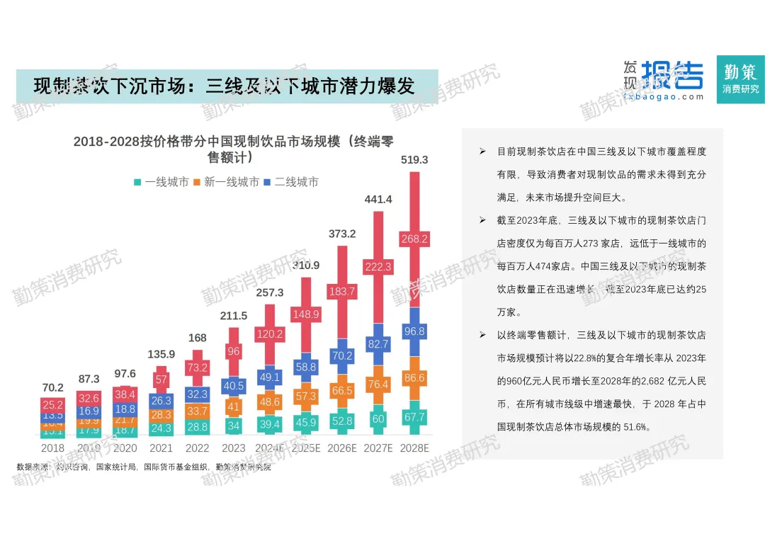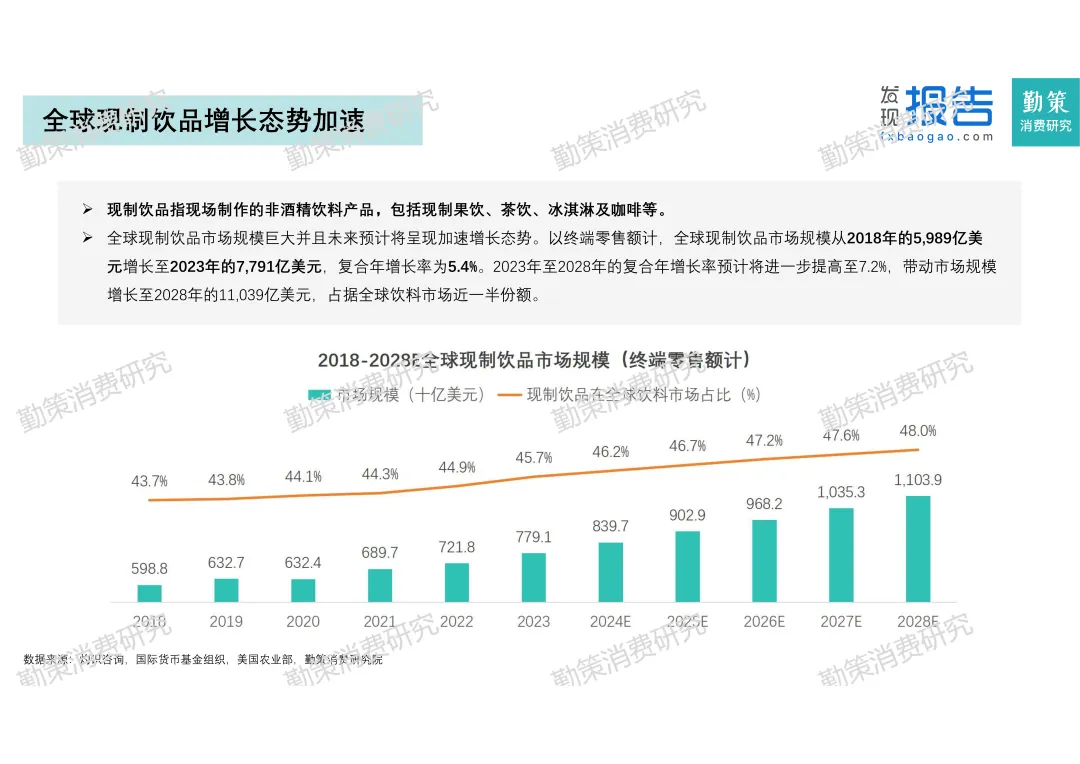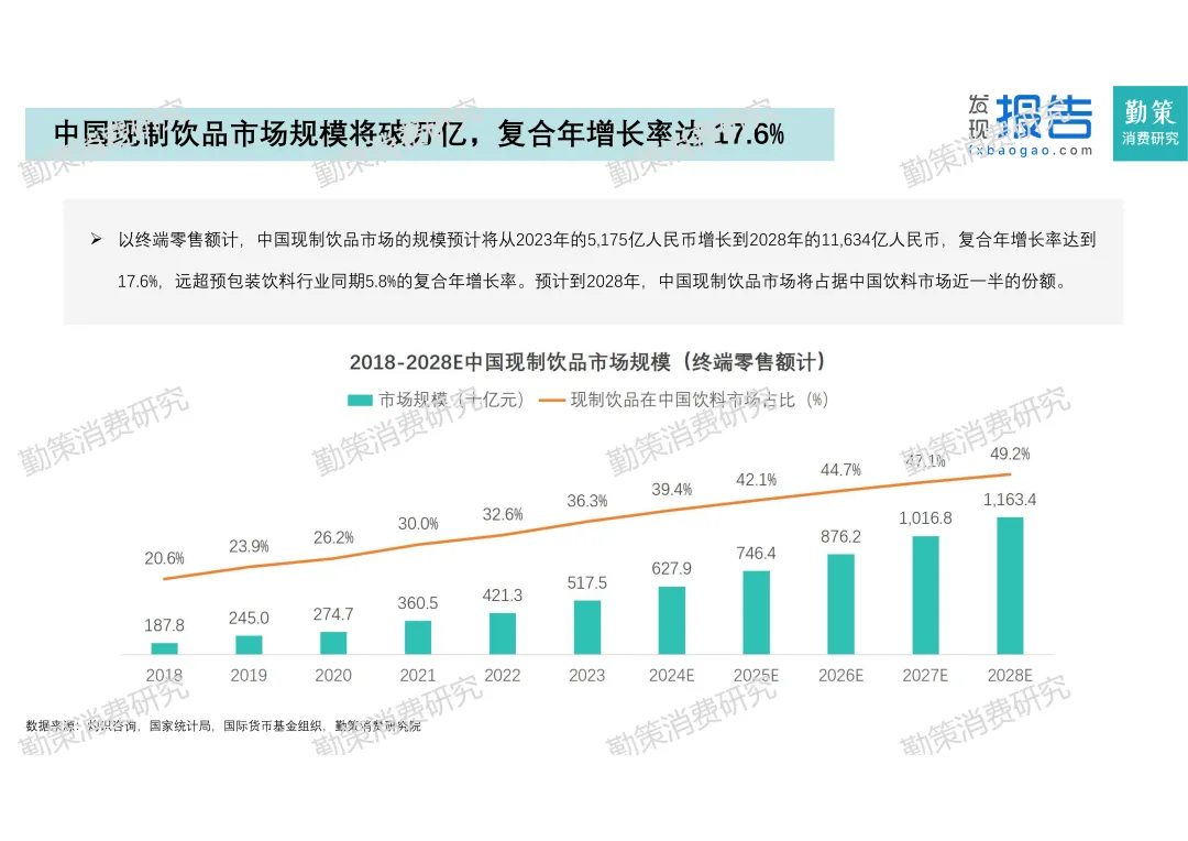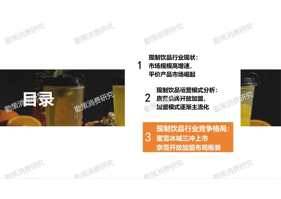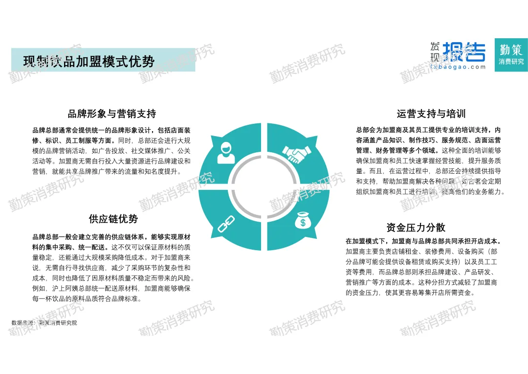 本报告由勤策消费研究发布,聚焦中国现制饮品行业,围绕市场规模增长、运营模式变革、竞争格局演变三大核心维度展开分析,揭示行业从直营主导转向加盟协同的发展趋势。