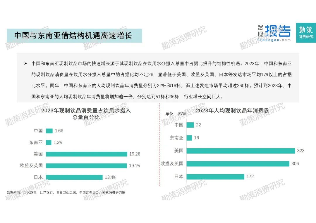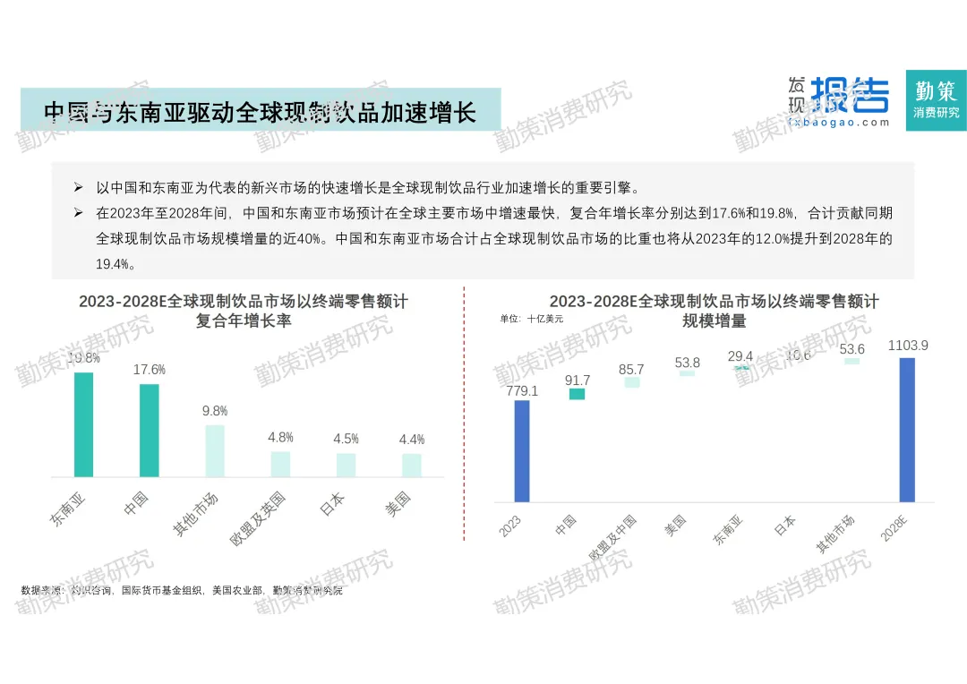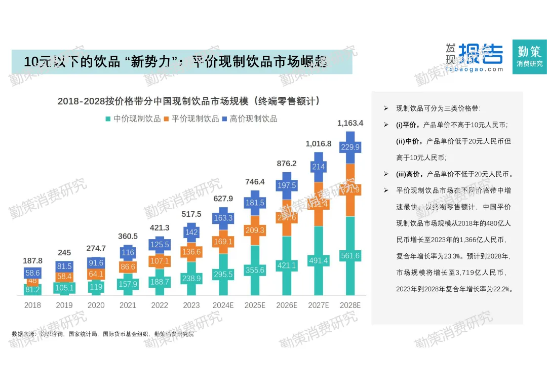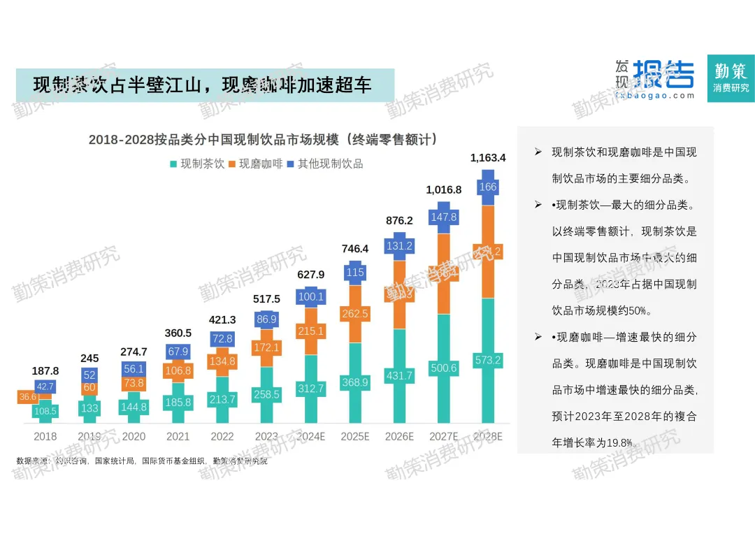全球现制饮品市场规模持续扩大,2023 年终端零售额达 7791 亿美元,预计 2028 年将增至 11039 亿美元。中国与东南亚是核心增长引擎,2023-2028 年复合年增长率分别达 17.6% 和 19.8%。中国市场表现尤为亮眼,规模预计从 2023 年的 5175 亿元增长至 2028 年的 11634 亿元,届时将占据国内饮料市场近一半份额。其中,平价现制饮品增速最快,2023-2028 年复合年增长率为 22.2%;现制茶饮占市场半壁江山,现磨咖啡成为增速最快的细分品类。