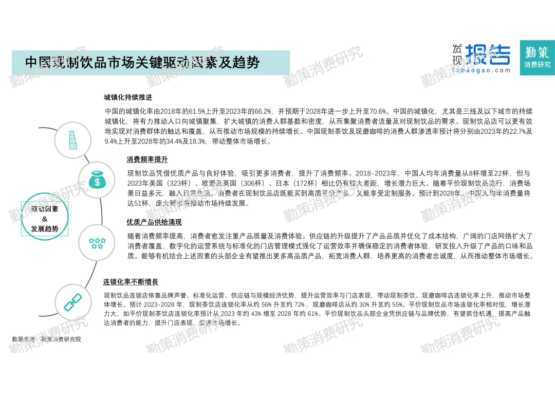 报告解读重点:现制饮品行业发展现状、直营与加盟的优劣势分析、行业竞争性分析、未来发展趋势预测。
