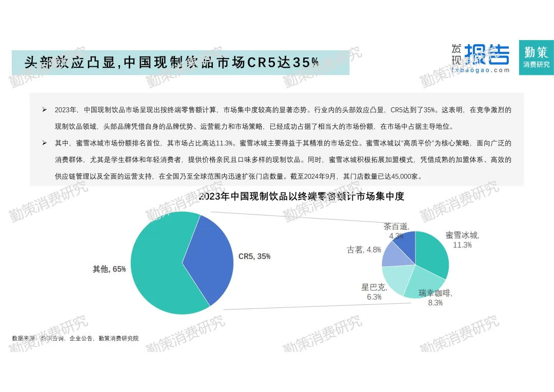行业竞争格局呈现头部效应凸显的特征,2023 年 CR5 达 35%。蜜雪冰城以 11.3% 的市场份额位居首位,依靠低成本加盟模式与下沉市场渗透率快速扩张,门店数超 45000 家。奈雪的茶则通过开放加盟与布局瓶装饮料业务,应对营收波动挑战。此外,新茶饮品牌掀起上市潮,但部分企业面临破发困境,反映出行业在资本市场的发展压力。