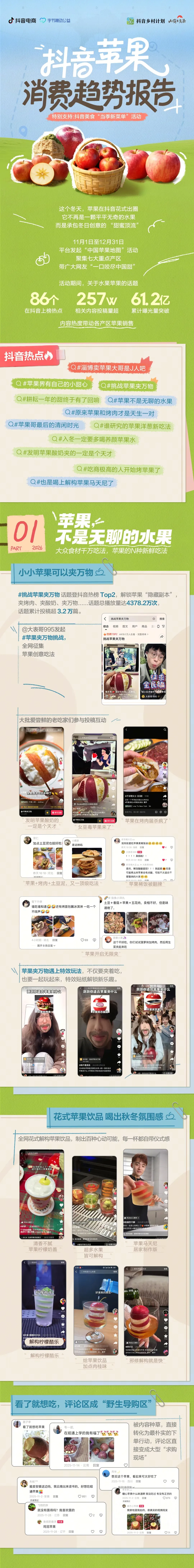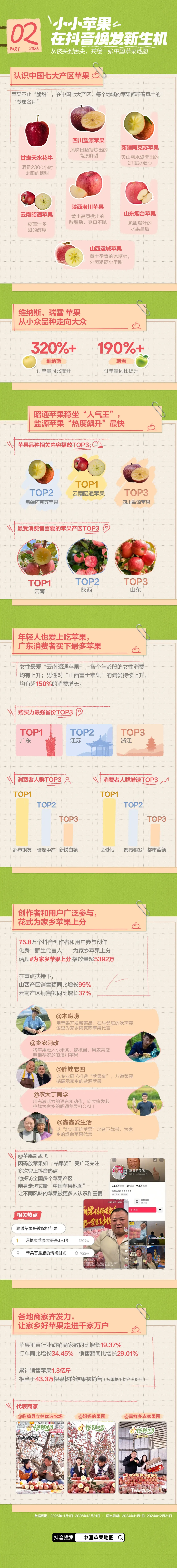 在抖音,苹果跳出食材本身,化身众多热门话题主角。@大表哥995 全网征集创意苹果吃法,#挑战苹果夹万物 登上热榜;@苹果哥孟飞 因码放苹果如“站军姿”受到广泛关注,苹果成了他出圈的暖心符号。活动期间,苹果相关话题曝光量超61.2亿次,相关订单同比增长34.45%,累计售出1.3亿斤,相当于43.3万棵果树的果走进千家万户。