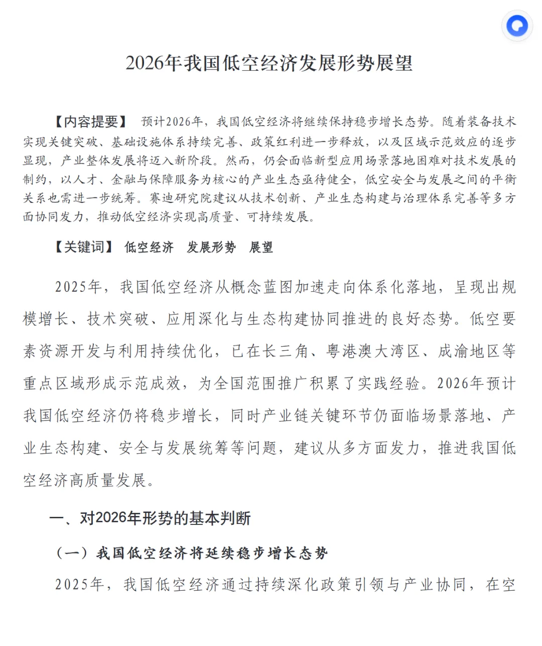 这些并非科幻电影的场景,而是赛迪研究院在《2026年我国低空经济发展形势展望》报告中所描绘的、正在加速到来的低空经济新图景。随着2026年的临近,我国低空经济正从概念蓝图走向体系化落地,一个立体化的“天空经济”新赛道已全面开启。