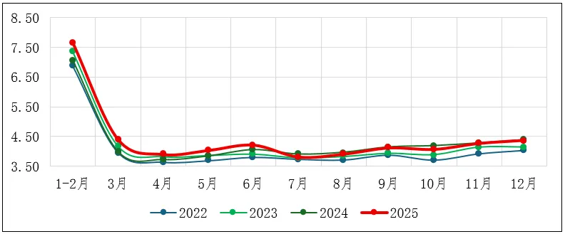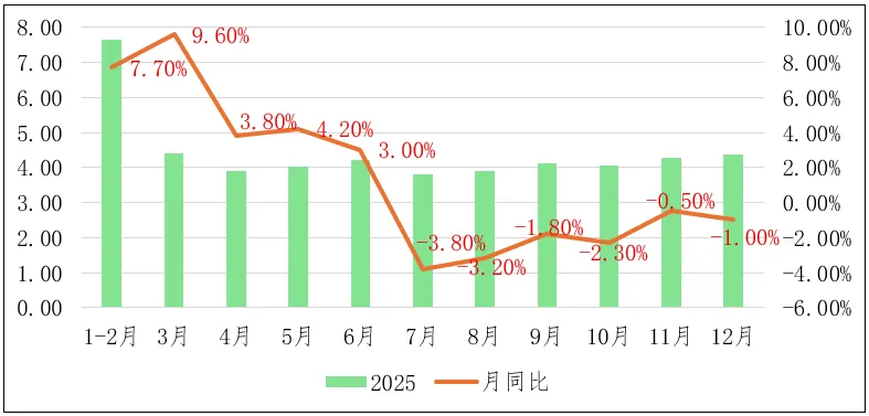 图2:2025年我国规上工业原煤产量及增速月度走势