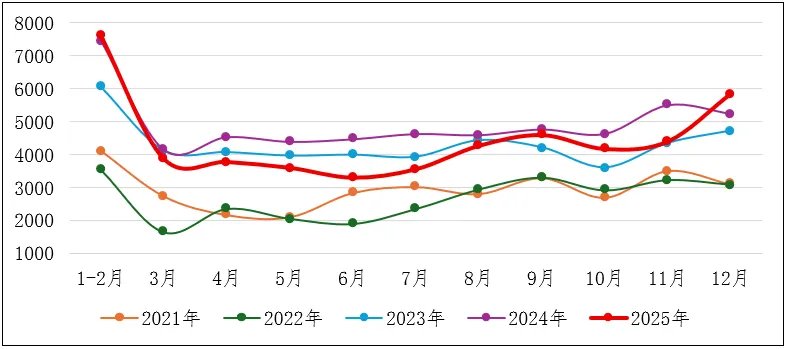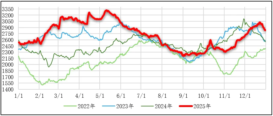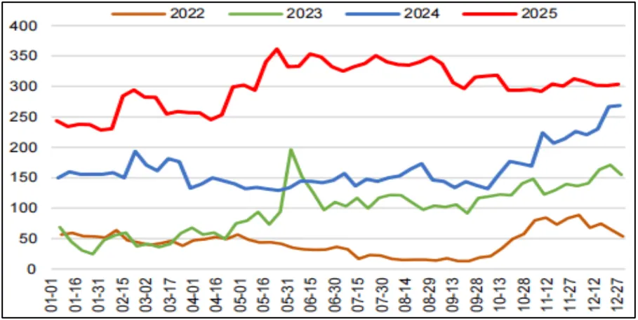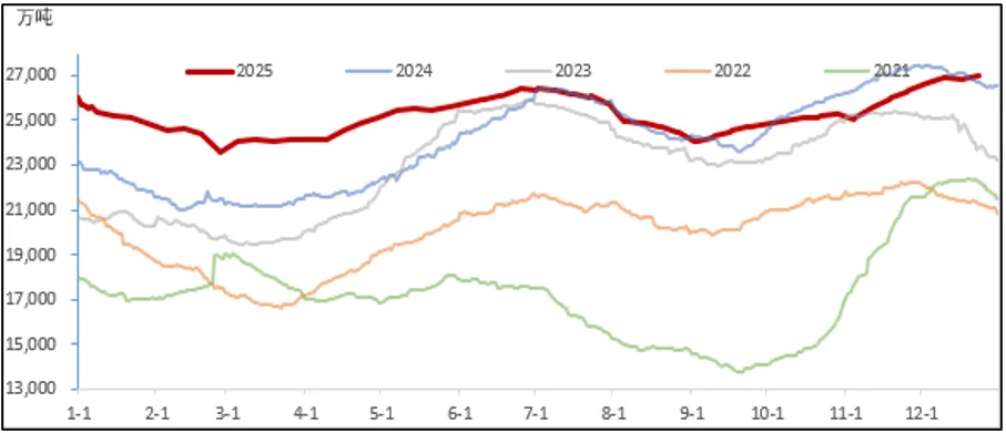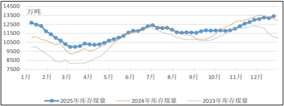 2025年全社会库存变化受季节性需求、政策调控、进口量波动等因素影响,存煤整体处于高位,供需宽松格局下库存压力较大。产地库存持续维持近年来的高位运行;北港库存呈现先升后降再升波浪形的态势,年内库存屡创历史新高;下游终端则淡季主动去库,旺季提前累库,整体延续了厂内高库存策略,大规模集中采购现象减少。