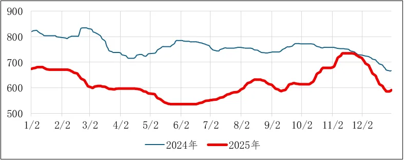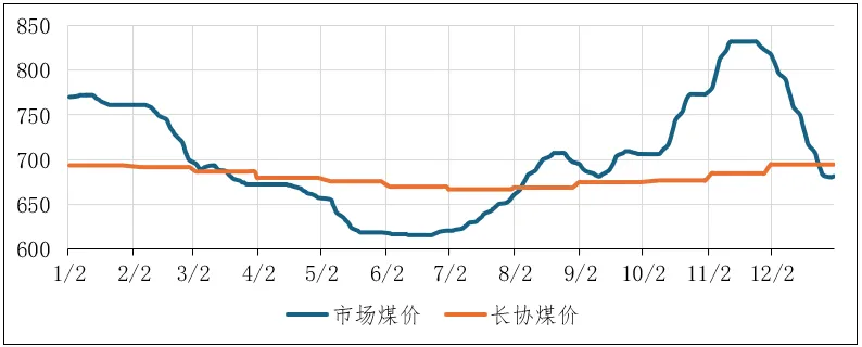 2.下半年价格触底反弹又高位回落7月起,国内实施“反超产”“反内卷”政策,煤炭产量增速放缓,叠加夏季用电高峰、迎峰度冬储煤需求释放、局部地区强降雨影响产运,供需格局逐步收紧,动力煤价格触底反弹,11月中旬创下全年最高价735元/吨。11月中旬后受高库存、气温偏暖、需求释放不及预期等因素影响,市场呈现“旺季不旺”特征,价格明显回调。直至12月下旬才止跌弱稳,年底收于591元/吨,此轮跌幅近150元/吨。