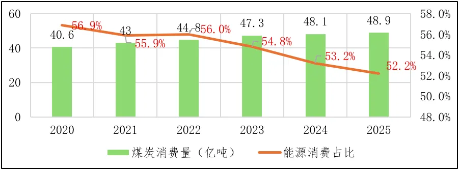 2025年,我国煤炭消费呈现出“总量高位趋稳、结构分化、占比持续下降”的特征。电力、钢铁、建材、化工四大高耗能行业的煤炭消费呈现“电力稳、化工增、钢铁韧、建材降”的分化特征。