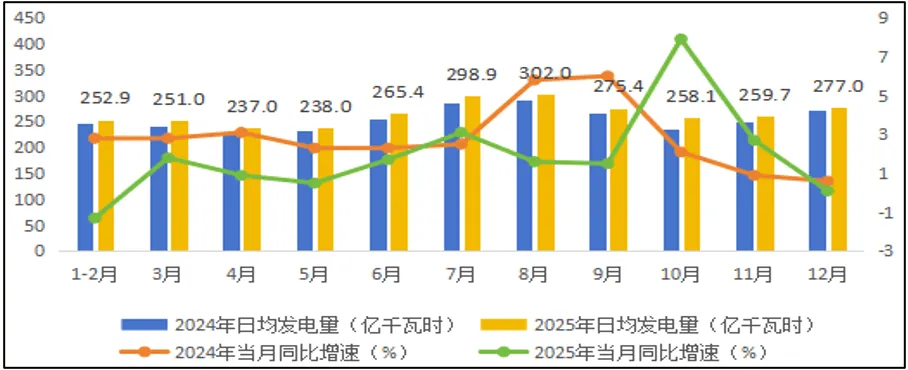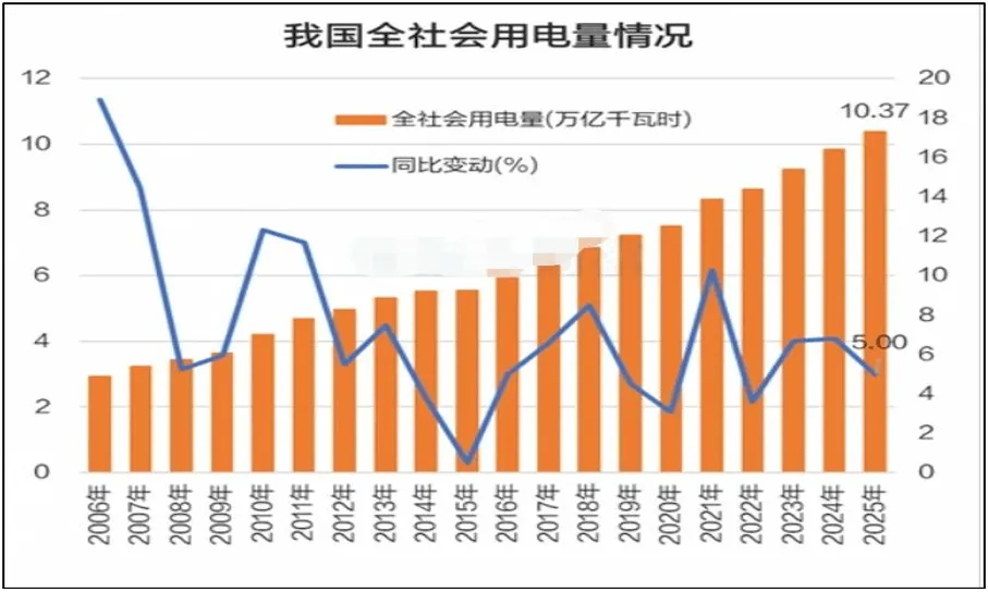(一)电力行业2025年,我国规模以上工业发电量97159亿千瓦时,比上年增长2.2%。其中,规模以上工业火力发电量62945亿千瓦时,同比下降1.0%,为10年来的首次下降。2025 年我国全社会用电量首超 10 万亿,达103682 亿千瓦时,同比增长 5%。电力行业仍是煤炭消费的核心领域,年消费量29亿吨(含供热机组),同比下跌0.4%。图14:2024-2025年规上工业月度发电量及增速