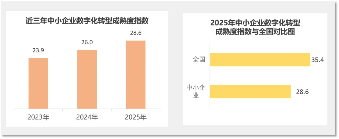 2023年至2025年间,中小企业数字化转型成熟度指数由23.9提升至28.6,但距离全国成熟度指数35.4,仍有较大差距,表明多数中小企业数字化转型基础较弱,资源投入、能力储备相对不足,导致整体平均水平落后于全国。