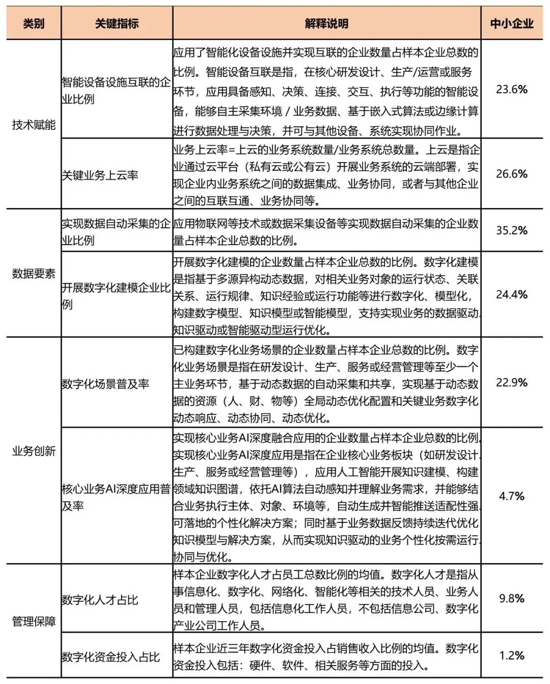在技术赋能、数据要素、业务创新、管理保障等方面,中小企业各关键指标的具体数据如下: