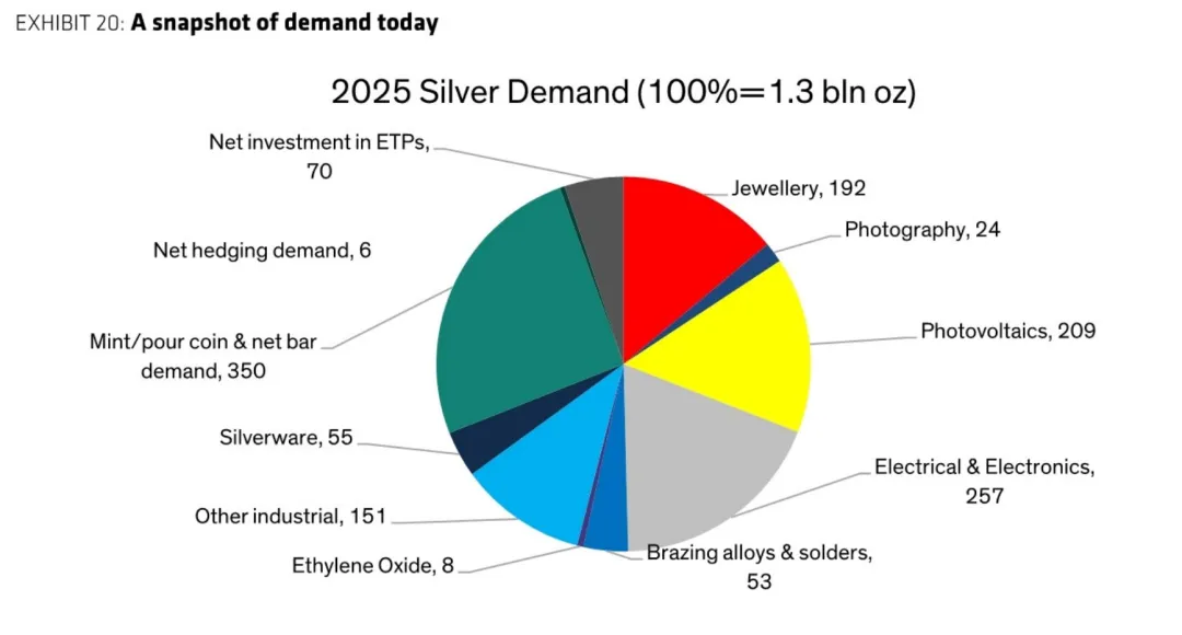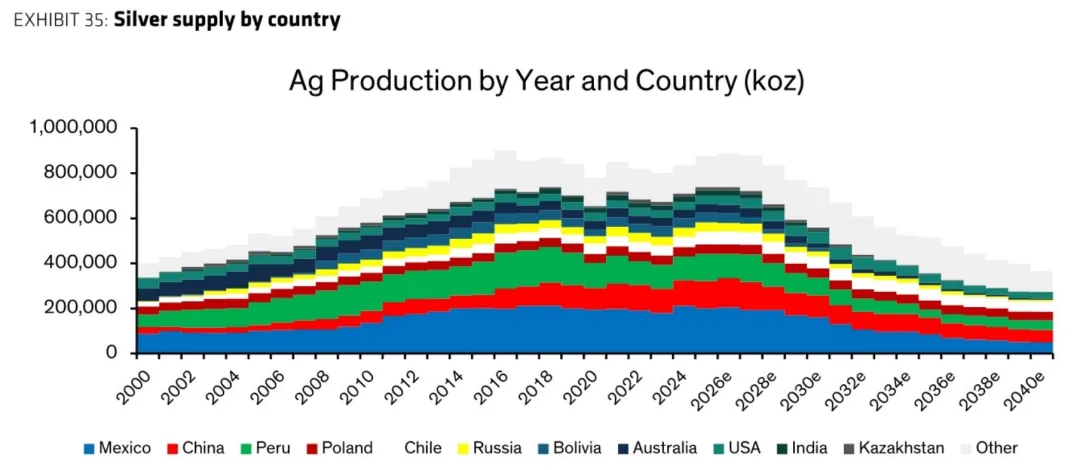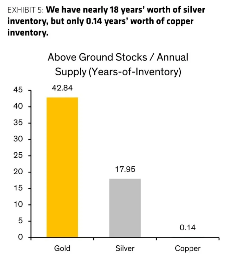 天量库存削弱了传统供需分析的有效性。 与只有约50天需求的铜库存相比,白银的地上库存(Above-ground stocks)极其庞大。报告 (Exhibit 5) 估算,全球地上的白银库存足以满足近18年的年化供应量。这意味着,市场上讨论的年度“供需缺口”在巨大的存量面前几乎失去了意义,短期内很难出现实质性的物理短缺。