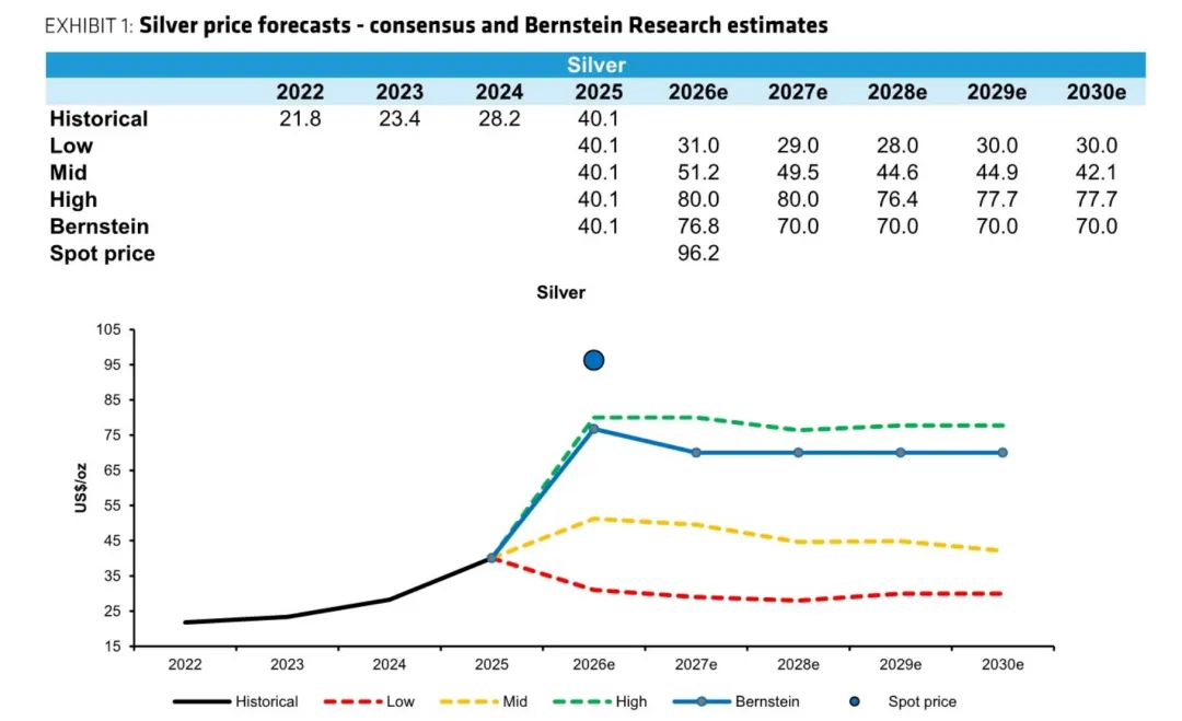 预测高于共识,但低于当前现货价。 报告预测,在70倍金银比的锚定下,2026年的银价将达到77美元/盎司,并在2027至2029年稳定在70美元/盎司 (图表1, Exhibit 1)。值得注意的是,虽然这一预测远低于报告发布时的现货价格,但却显着高于当时华尔街约51美元/盎司的共识预测。