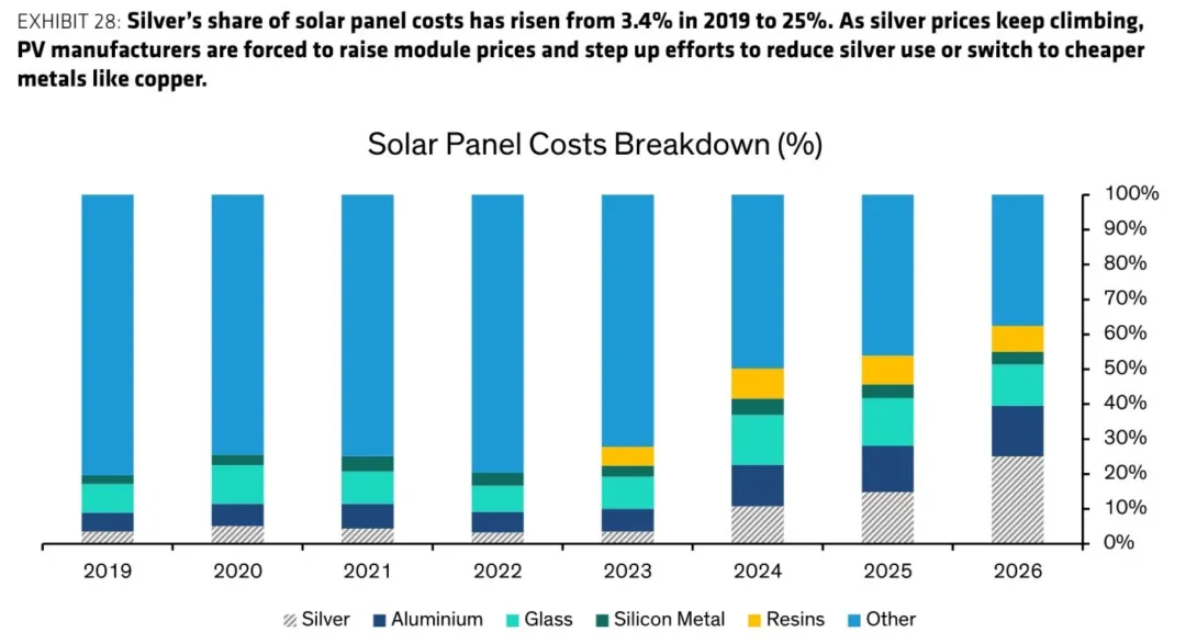 高银价催生替代风险。 报告提出了一个重要的风险点:成本驱动下的技术替代。随着银价飙升,白银在太阳能电池板成本中的占比已从2019年的约3.4%急剧上升至25% (图表28, Exhibit 28)。这极大地激励了光伏制造商研发和应用低银或无银技术,例如使用更廉价的铜来替代白银。报告指出,包括隆基绿能在内的多家光伏生产商已有计划在2026年开始量产使用贱金属的太阳能电池,这可能在长期内对白银需求构成威胁。