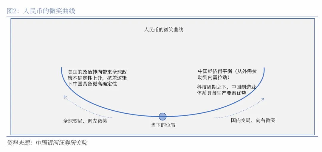中美双强,向右微笑。虽然美国政策的中期框架是重塑三个体系,但阶段性也会回归聚焦国内,刺激经济,这将带来美国例外论的回归,推动美元再次走强。在此情形下,长周期来看,人民币依然有来自内部的两条主线推动其相对美元升值。第一,“十五五”时期中国自身的经济再平衡,即从外需驱动转向内需驱动。中国经济再平衡将推动温和再通胀,这将带来中国资产回报率的上行,推动国际资本流入中国,国际收支金融账户的显著改善将成为推动人民币升值的重要因素之一;第二,科技周期之下中国的科技叙事。2023年之后美国的AI叙事推动资金不断涌入美国。而中国已凭借自身的科技突破,拥有属于自身的科技叙事。未来对于科技叙事的交易将从目前非常拥挤的算力逐步向上下游扩散,国际资本将从美国流入上游的资源国以及下游的制造业国家。中国强大的现代化产业体系将吸引国际资本流入中国。因此,人民币以及人民币资产将受益于自身的经济结构转型和科技叙事,推动人民币的长期升值。