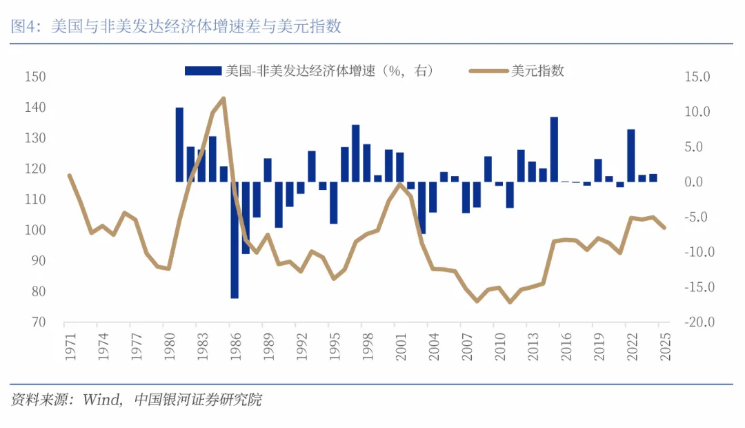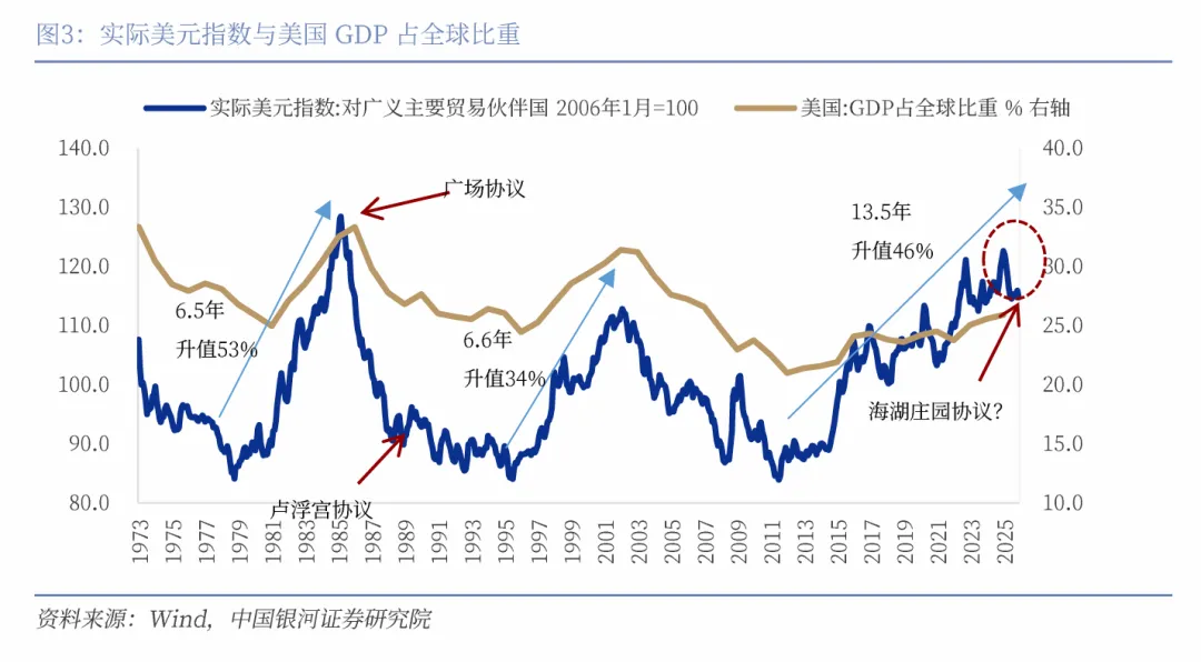美元可能已经来到了顶点,近14年的升值周期将被终结。观测对广义主要贸易伙伴国的实际美元指数,1973年至今美元经历了三轮升值周期,我们现在可能身处第三轮升值周期的终点。前两轮升值周期持续的时间都在6年半左右。第一轮是1978年至1985年,实际美元指数从底部累计升值了约53%,随着广场协议推动美元贬值而终结。第二轮是1995年至2002年,实际美元指数从底部累计升值了约34%。我们现在身处第三轮升值周期,本轮升值周期开始于2011年,至今已持续了近14年,时间长度是前两轮的两倍之久。实际美元指数从底部累计升值了近46%,至今的最高点是2025年1月,对广义主要贸易伙伴国的实际美元指数为122.6,与广场协议之前的数值已十分接近,均位于历史高位。