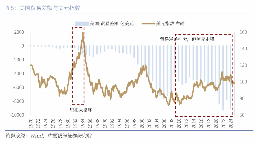 美国的贸易赤字不断扩张。本轮美元升值周期始于2011年,这期间美国的贸易赤字不断扩张,从2011年的5545亿美元扩张至2024年的9035亿美元。贸易赤字的扩张对美元升值不利,但这种不利影响被高赤字率和持续流入的国际资本抵消。