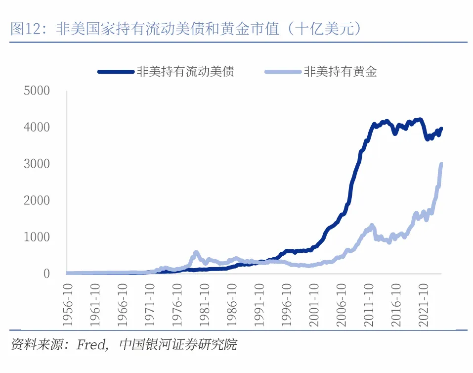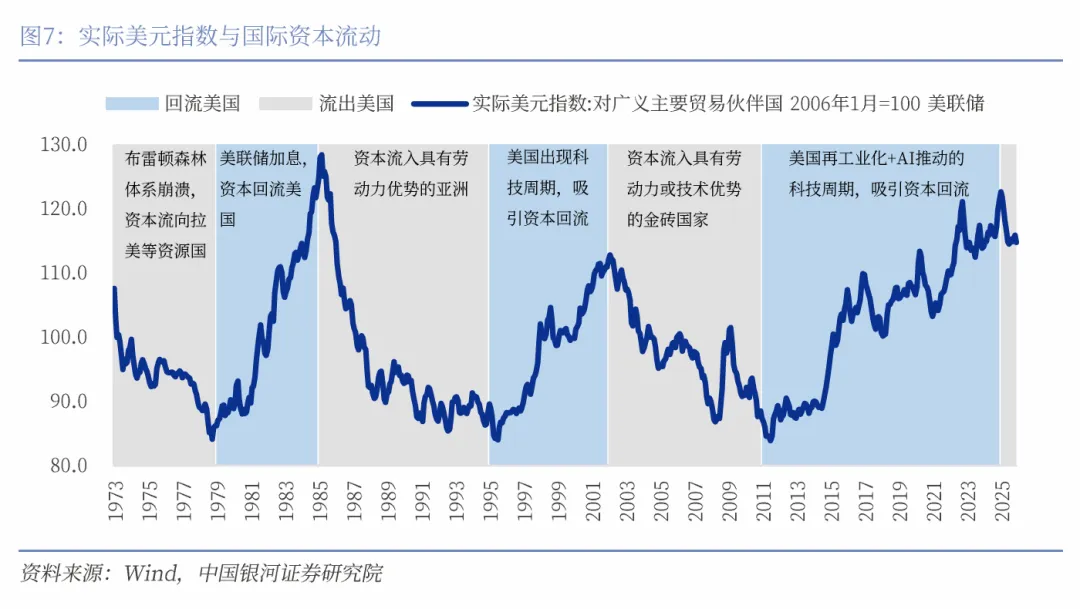 推动美元超长升值周期的因素之二:持续流入的国际资本。如果我们观察1970年以来的数据,发现每一轮美元的升值都伴随着资本回流美国,而每一轮美元的贬值周期亦伴随着资本流出美国。1971年的“尼克松冲击”直接导致布雷顿森林体系的瓦解,美元不再挂钩黄金,随后各国开启浮动汇率制度。此后全球资本流入具有资源优势的拉美国家,流出美国。这一趋势在1979年逆转,美联储开启加息,更高的利率吸引资本回流美国。改变发生在1985年,亚洲凭借劳动力优势吸引资本流入亚洲。这一趋势持续到1995年,美国基于互联网应用的兴起出现科技周期,再次吸引资本流入美国。2002开始,金砖国家再次吸引资本流入。2011年,美国推动再工业化,资金再次回流美国,2022年OpenAI正式推出ChatGPT,开启人工智能革命推动的科技周期,进一步吸引国际资本流入美国。