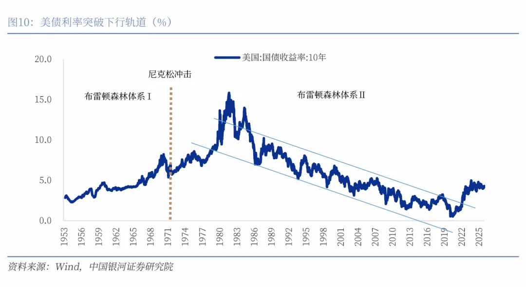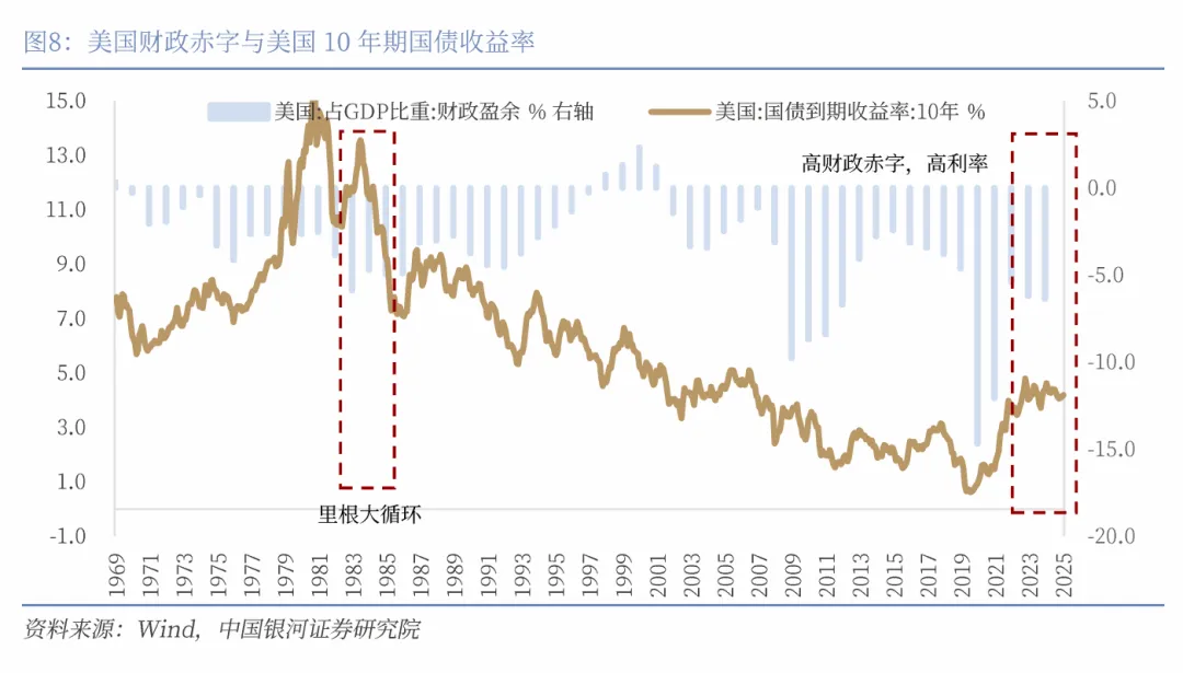 美国财政赤字进一步上升的空间已极为有限,美国债务的持续性受到市场越来越多的质疑。非战争或危机时刻,高达7%的赤字率不具备可持续性。“大美丽法案”暗示美国将赤字逐步缩减至3%的构想不过是空中楼阁,赤字水平将在特朗普任期内(2026-2028)保持在7%上方,2033年可能突破8%。这将加剧市场对于美国债务可持续性的质疑。赤字率的上升并非没有尽头,一但到达特里芬临界值,美元将走下神坛,失去其储备货币的地位。
