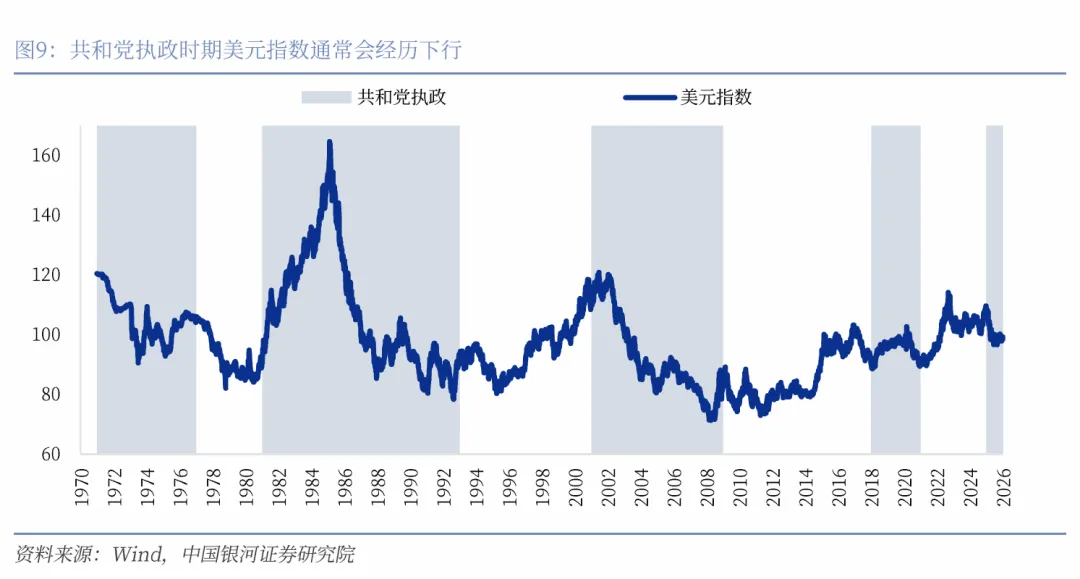 长期以来,美国的高科技公司其实是依靠全球化取得高利润率。而当下美国出现政治转向,走向孤立主义,这必然带来美国巨头公司的利润率下降,将系统性的对美股的盈利能力产生冲击。我们观察到美元往往在共和党执政时期会经历下行,这背后是共和党往往推行保守主义,保守主义往往会损害美元大循环,而全球化之下的自由贸易则会推升美元的影响力,并推动其走强。