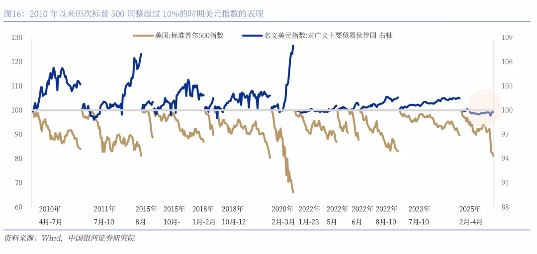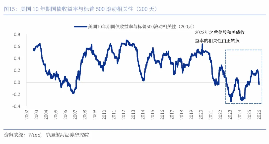 传统规律正在失效,美元资产内部已无法完美对冲风险。我们通常认为美股快速下跌的时候,美元,美债通常会上涨,因为美元,美债通常被视为安全资产。但这一传统自2022年开始已被打破,美元资产的脆弱性上升。美元资产内部已无法完美对冲风险。2022年之后,美股和10年期美债收益率的相关性由正转负。