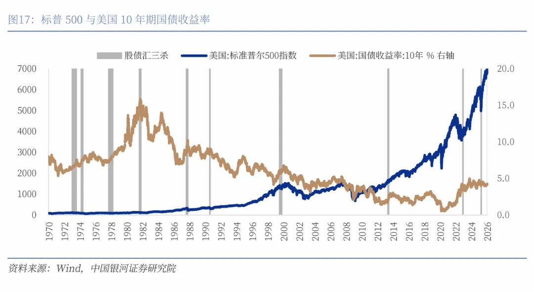 2025年二季度美国市场出现罕见的股债汇三杀。2010年以来,标普500指数调整超过10%总计发生过13次,除了2025年2月到4月的这次调整之外,历次都是伴随着美元的走强。但是2025年二季度的这次美股调整却出现了十分罕见的美元走弱。但如果我们拉长时间维度来看,我们所认为的传统其实只存在于“大缓和”时代,美国股债汇三杀在上世纪70-80年代的“大通胀”时代其实并不罕见。我们认为2025年美国股债汇三杀的发生并非偶然,在未来2-3年发生的概率将显著高于过去20年。