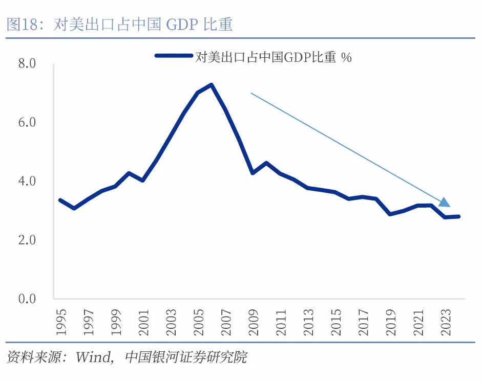 中美经济周期的相关性显著降低,这背后是两个经济体的经济依赖度在降低。2022年之后,中国对美出口占中国GDP的比重出现较为明显的下降。当下美国政治转向,试图重塑全球贸易体系、金融体系和安全体系的行动,会使得中美经济依赖度进一步降低,表现在中美库存周期难以共振。