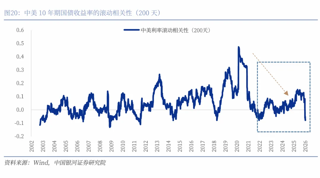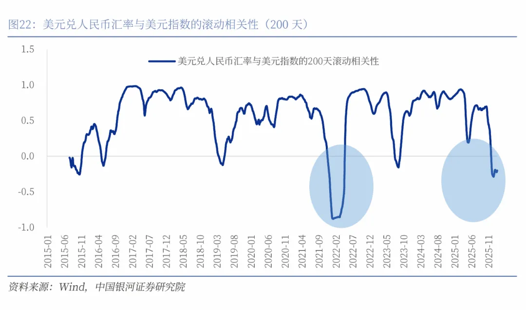 观察2015年至今数据发现,美元兑人民币汇率与美元指数的200天滚动相关性通常位于正值区间,即当美元指数走强时,人民币对美元汇率通常出现贬值压力。但是也有不同于传统规律的时段,一个比较典型的时段是2021年的12月到2022年的4月,美元兑人民币汇率与美元指数的200天滚动相关性落入负值区间,两者呈现负相关性,美元的走强与人民币对美元升值同时出现,即我们说的中美双强,向右微笑。我们观察到2025年12月开始,两者的200天滚动相关性再次落入负值区间,是值得重视的重要信号,人民币对美元汇率有可能在美元指数走强阶段亦出现升值。