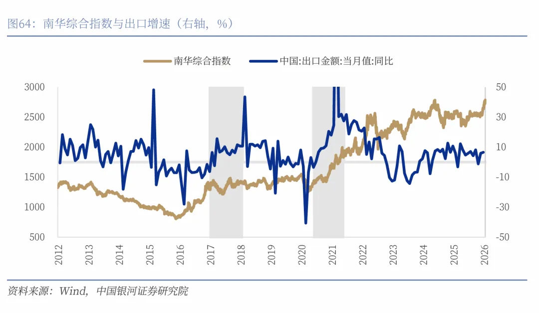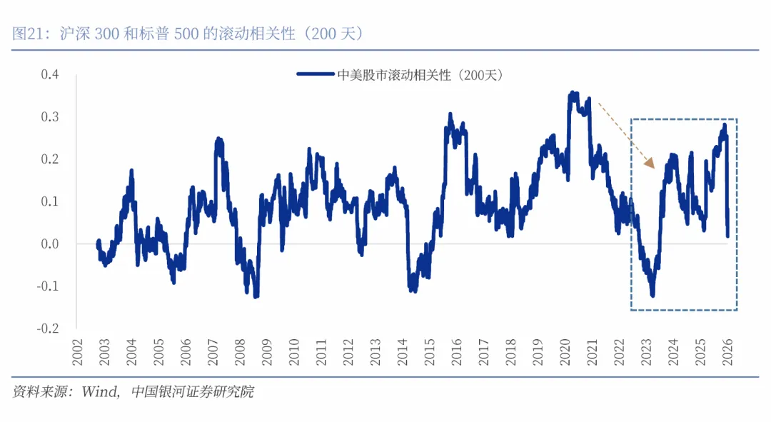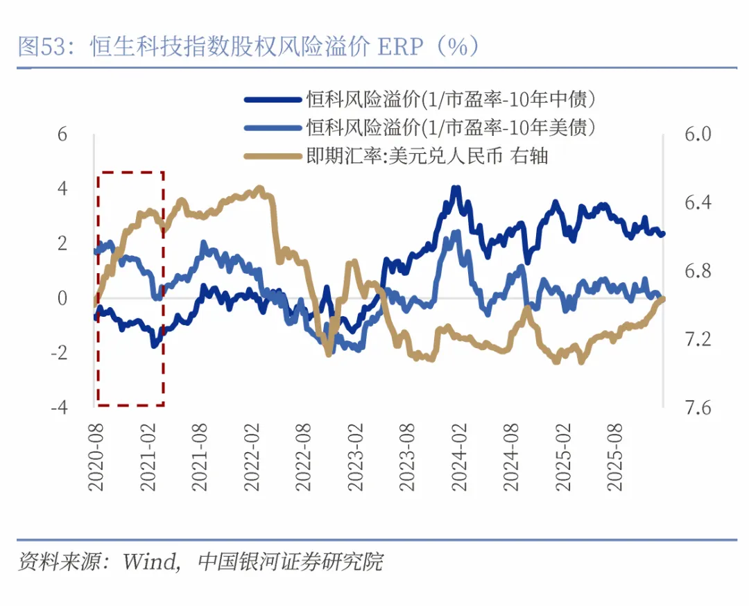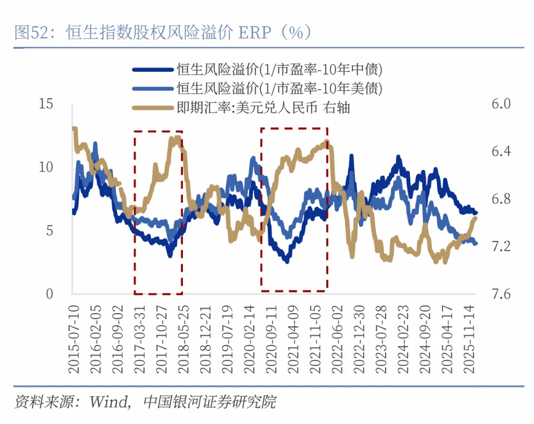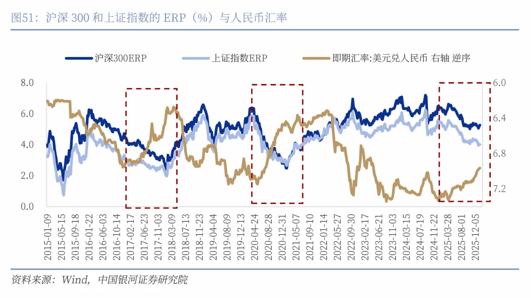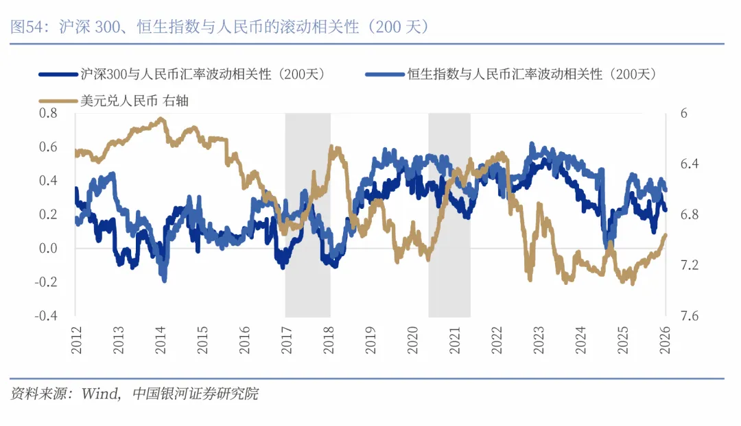 2017年之后,沪深300和恒生指数与人民币汇率呈现持续正相关性。人民币升值将使中国股票受益,这表现在三个维度:第一,从国际资本流动的维度来看,人民币稳健升值往往意味着宏观经济基本面良好,这有助于增强全球投资者对中国资产的信心,降低汇率波动带来的对冲成本,从而压低股票市场的风险溢价。当前A股和恒生指数的风险溢价已出现下行,反映出投资者风险偏好回暖,以及对宏观稳定与政策托底的定价正在逐步修复。