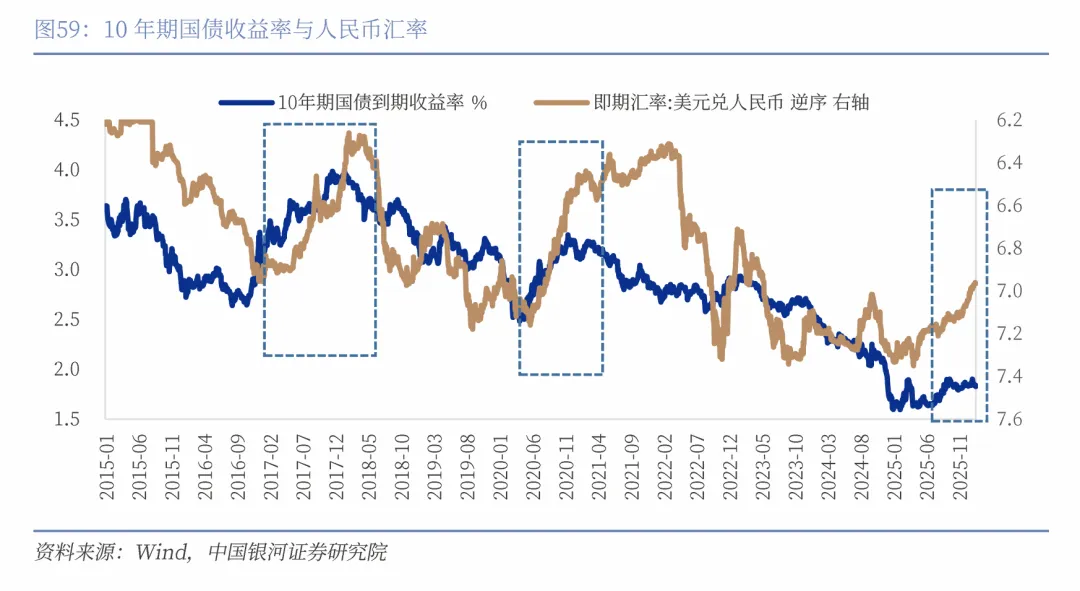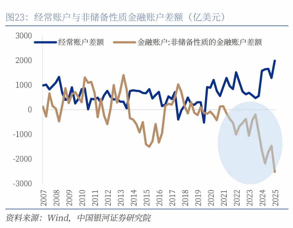2026年中国进入“十五五”时期,统筹国内国际两个大局、推动经济再平衡成为新的时代主题,包括供给稳增长向需求稳增长的再平衡、外需驱动向内需驱动的再平衡、投资拉动向消费拉动的再平衡,最终我们有望看到经济再平衡、温和再通胀的结果。而温和再通胀有利于提升国内资产的回报率,从而改善中国非储备性质的金融账户的流出压力,这将是长期推动人民币汇率稳健升值的重要动力。