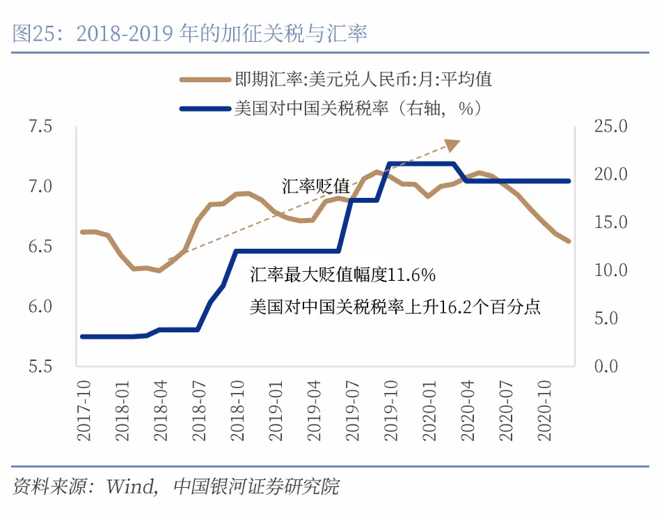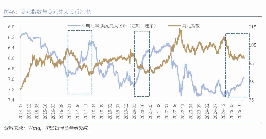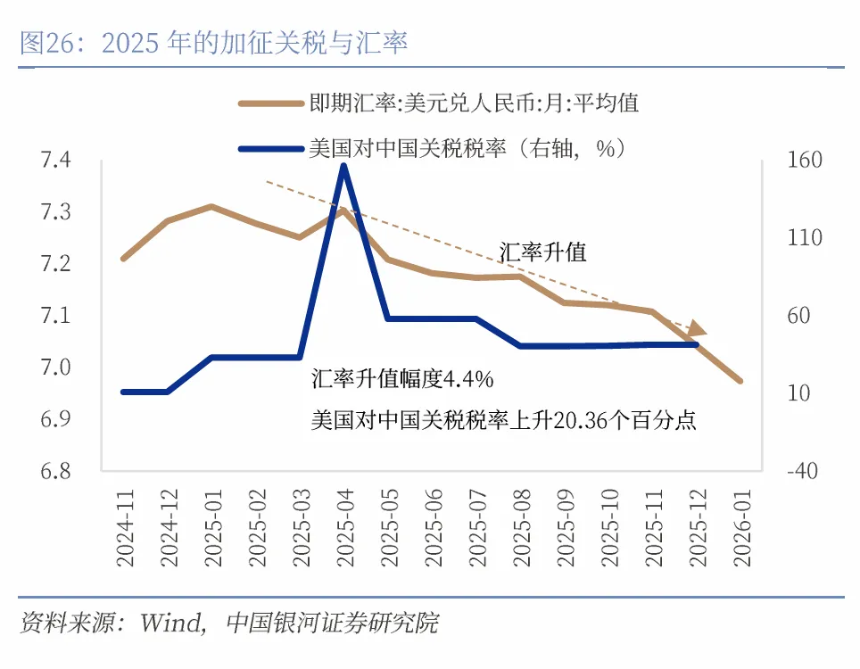 2018年-2019年美国对中国加征关税时期,美国对中国的进口商品的关税税率上升了16.2个百分点,期间人民币对美元的最大贬值幅度是11.6%,上一轮美国对中国加征关税的影响部分通过人民币贬值来消化。但人民币不会两次踏入同一条河流,2025年美国再次开启新一轮对中国加征关税,但是本轮美国加征关税的影响并未通过人民币汇率贬值来消化,相反人民币展现了强大的韧性,呈现稳健升值。2025年末美国对中国的进口商品的关税税率较上年末上升了约20.4个百分点,人民币对美元全年则升值了约4.4%。