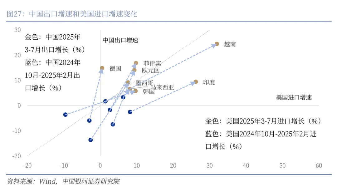 出口商品竞争力的提升和目的地的多元化带来了中国出口韧性,这背后是中国在全球供应链的不可替代性。我们观察到对等关税表面上改变了全球的贸易格局,但源自中国的贸易品比例变化可能并不明显。受关税影响,美国向其他经济体增加替代品进口,如越南、印尼等多个亚洲经济体对美出口增长,但多数国家从中国进口数量同样增加,即向美国的出口商与向中国的进口商呈现高度相关。说明中美贸易战并未实质性撼动中国在全球供应链中的地位,而是推动了贸易路径的复杂化。