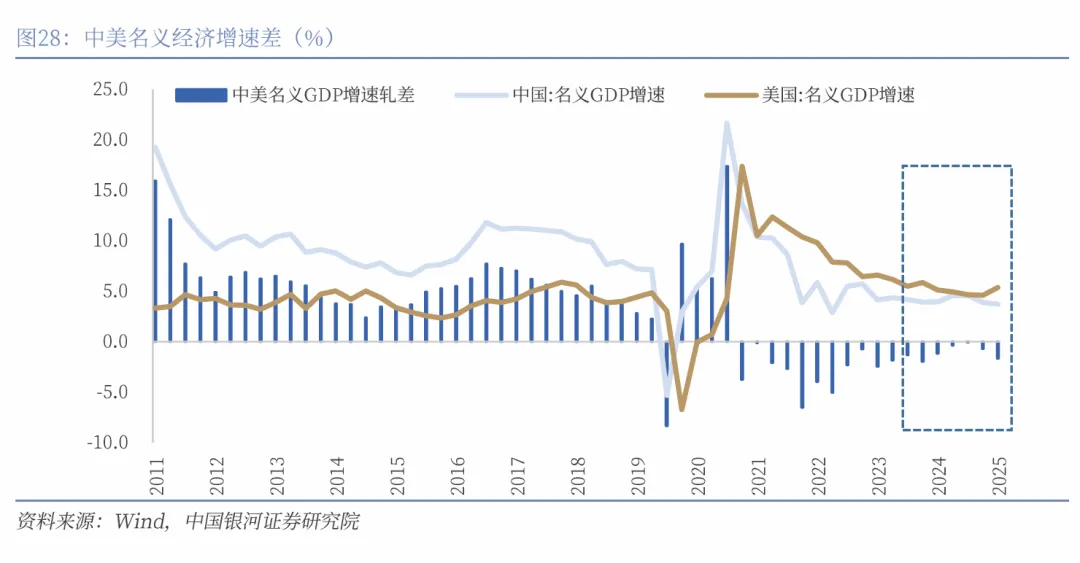 与基准情形相比,乐观情形中,我们给了中国名义经济增速更为出色的表现,房地产跌幅大幅收窄和基建回暖,制造业保持高位,消费持续回升。这需要政策层面更加注重“稳增长”,全球经济稳定增长和贸易环境大幅好转。2026年全年有望实现6.0%的增长;与此同时给了美国名义经济增长更为悲观的假设,关税的全部成本在企业端体现,制造业订单收缩幅度扩大,贸易相关行业的库存调整周期延长,资本开支从前期扩张转为缩减,使其名义GDP增速可能落到2.2%–3.3%区间。