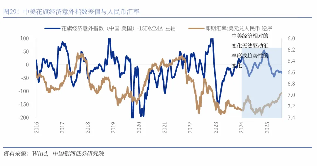 中美经济周期弱化,经济增速很难形成明显趋势从而驱动人民币升值。如果我们观测2015年以来的人民币两轮升值周期,第一轮为2017年1月至2018年1月,第二轮为2020年6月至2021年5月,第一轮时期中国的名义经济增速高达10%以上,第二轮则是中国经济率先企稳并快速回升。我们观察中美名义经济增速,自2024年以来,波动都非常有限,中美经济周期弱化。中国名义经济增速保持在4%-4.6%区间附近,美国则在4.6%-5.7%之间,中美名义经济增速的差值在-1%附近波动,没有形成较为明显的趋势变化。同样,中美花旗经济意外指数的差值通常与人民币汇率走势保持一致,这背后的逻辑是中美经济增速的相对优势主导汇率的变化,然而我们发现进入2024年,两者的走势出现比较明显的分化。