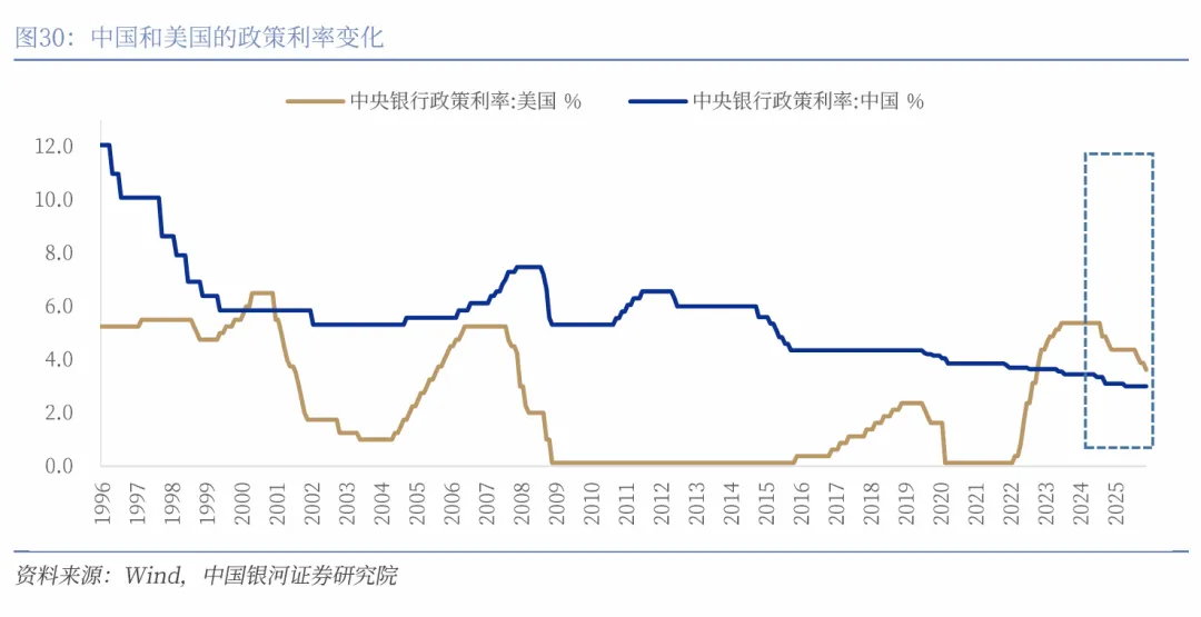 货币政策将从中性因素逐步过渡到积极因素。美联储在2025年9月再次开启降息周期,中性预期2026年有望累计降息75BP。在美联储再次开启降息之后,货币政策对汇率的影响将从中性因素过渡到积极因素。