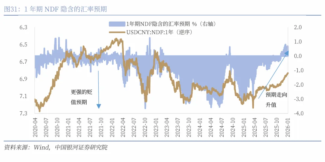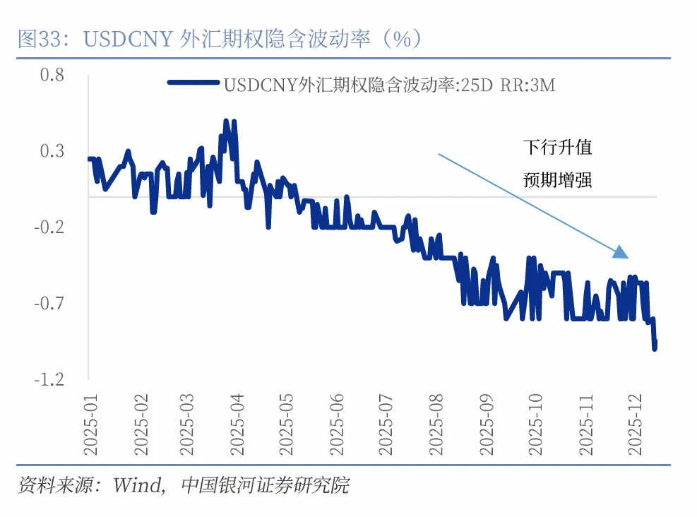 市场对人民币的预期已在2025年发生根本变化,由过去三年的贬值预期转为升值预期。我们使用三个指标来观察市场对于人民币汇率的预期:1、离岸人民币与在岸的汇差;2、1年期NDF隐含的汇率预期;3、USDCNY风险逆转期权的波动率。三个指标均显示,进入2025年5月至今,人民币贬值预期明显走弱,升值预期则不断走强。CNH与CNY价差明显收窄,部分时间汇差为负值,显示离岸人民币表现更强。1年期NDF隐含的人民币汇率贬值预期也从5月开始明显减弱,并从11月末开始进入正值区间,即升值预期。风险逆转期权显示升值预期自5月开始走强,5月至今Delta值为25的3个月USDCNY风险逆转期权的波动率快速下行,并进入负值区间,负值代表升值预期。
