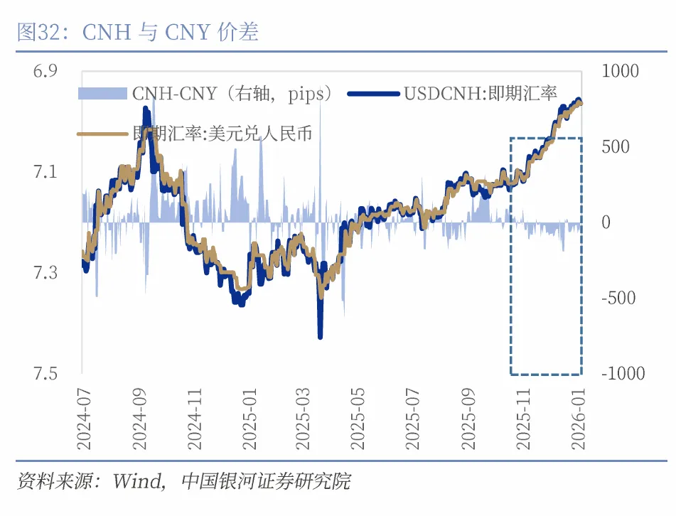 11月底以来人民币汇率加速升值主要受到两个因素的推动:其一,市场进入“弱美元”交易,11月末至今美元指数从100.22下跌至97.51,跌幅近2.7%。非美货币普遍呈现升值;其二,从内部来看,年末人民币结汇需求通常季节性走强,叠加较强的升值预期,2025年年末的结汇需求显著强于季节性,12月银行代客结售汇顺差达999亿美元创历史新高,外汇供求关系有利于人民币走强。但是我们观察到央行已释放逆周期调节的政策信号,我们认为人民币汇率将呈现稳健的升值状态,而非“急涨”。观察历史数据,1月份人民币季节性结汇需求也相对较强,但2月、3月通常会季节性走弱,升值速率也会放缓。从技术层面来看,人民币汇率下一个比较重要的点位可能在6.85。全年来看,人民币汇率依然是双向波动,不会呈现单边的升值走势。