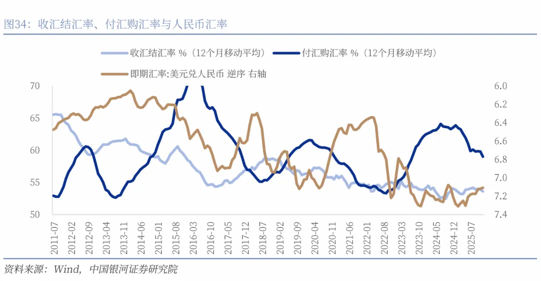 市场对人民币的预期发生转向,这将与资金流入形成螺旋共振,推升人民币的结汇需求以及减少美元的风险敞口。观察历史数据,人民币升值期间通常会带动收汇结汇率的上行和付汇购汇率的下行。展望2026年,人民币较强的升值预期以及稳健升值的走势将形成共振,带动人民币结汇需求的上升以及美元购汇需求的走弱,从外汇供求关系推动人民币稳健升值。