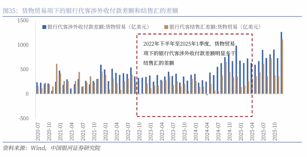 前期部分累计的结汇需求可能释放,形成对人民币汇率的支撑。自2022年下半年开始,市场基于对人民币汇率的贬值预期,结汇意愿不强。表现在货物贸易项下的银行代客涉外收付款差额持续明显多于结售汇的差额。我们测算可能有7000-10000亿美元的结汇需求在未来的升值周期逐步释放,资金流入人民币,将对人民币汇率形成进一步支撑。2025年12月货物贸易项下银行代客结售汇顺差达1113亿美元,创出历史新高,显示前期部分累积的结汇需求在人民币汇率升值预期之下正在逐步释放。