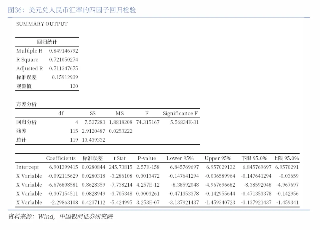 其中y为美元兑人民币汇率,X1、X2、X3和X4是4个数据指标,分别刻画中美名义经济增速的相对优势、中美货币政策、外汇供求关系和央行汇率政策。回归方程式的R Square= 0.7223,刻画四个因子的所有X的P值均小于0.05,说明我们拟合的方程式可以解释美元兑人民币汇率变动的约72%的原因,且每个因子对汇率的影响均显著。