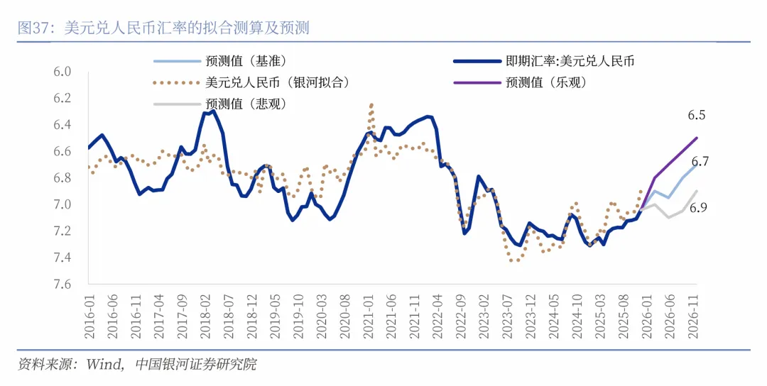 展望2026年,基准情形之下,中国名义经济增速呈现回升、美联储降息幅度高于人民银行,中国出口增速保持韧性,人民银行汇率政策为保持汇率基本稳定,人民币将呈现稳健的温和升值,美元兑人民币汇率年末将升至6.7。悲观情形下,美元兑人民币汇率年末将升至6.9;乐观情形下,美元兑人民币汇率年末将升至6.5。