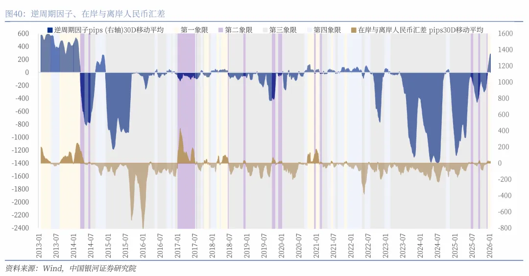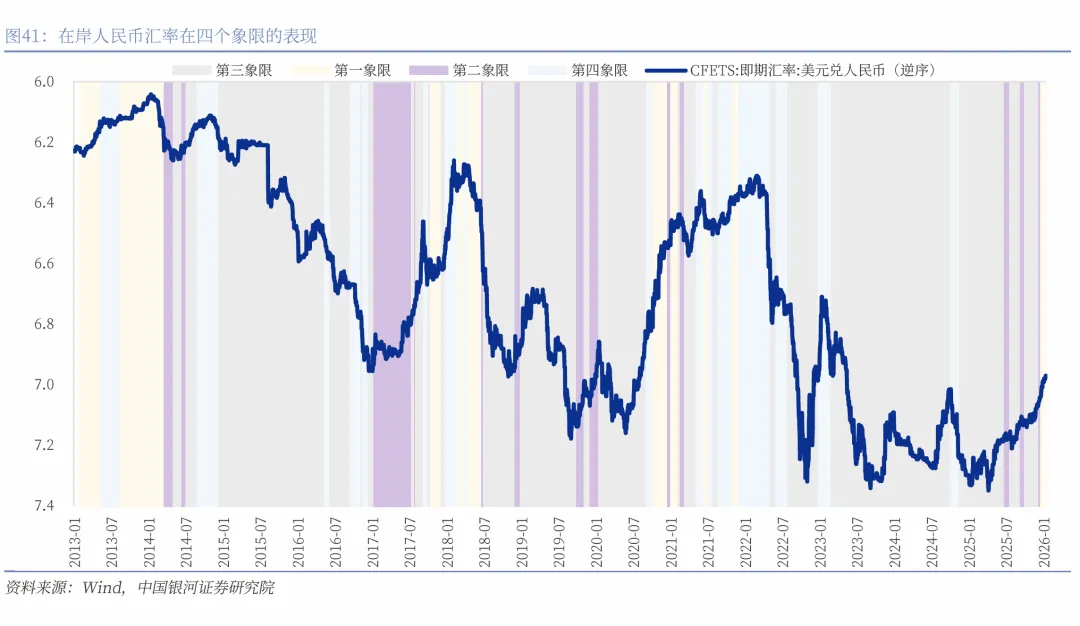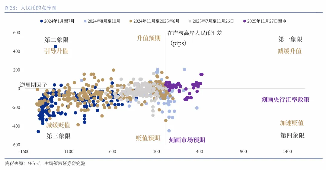 第一象限:市场持有较强的升值预期,央行实施逆周期调节,保持人民币汇率基本稳定。单边押注升值的顺周期行为将得到纠偏,人民币升值速度可能呈现减缓。2025年11月27日至今处于该象限。