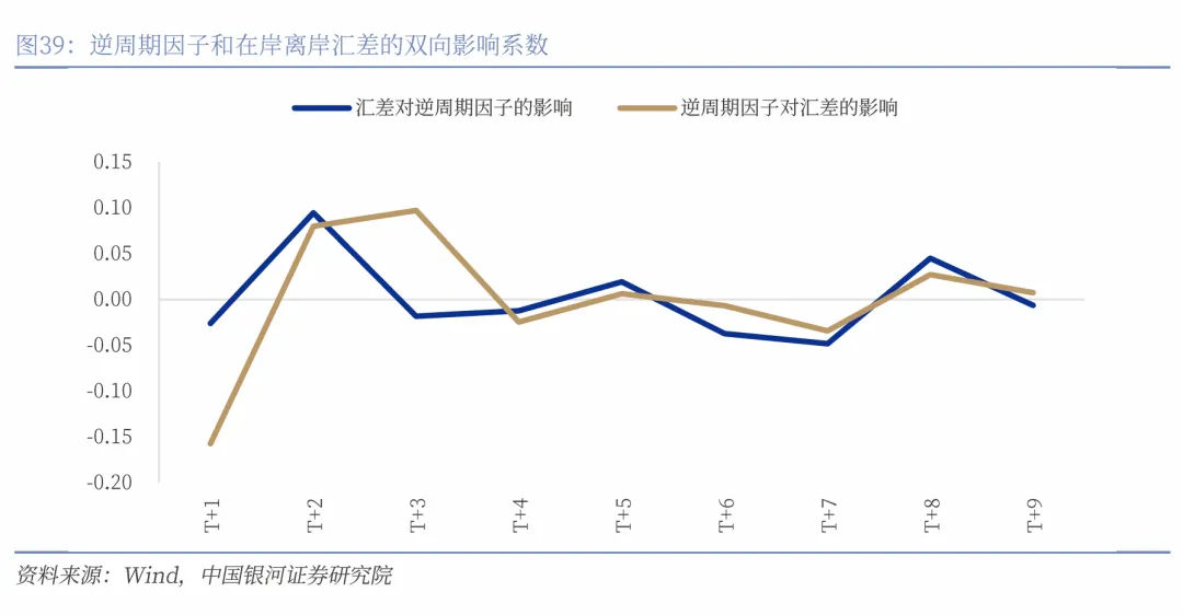 逆周期因子和在岸与离岸人民币汇率的汇差分别作为横纵坐标轴,两者之间存在明显的双向因果关系。格兰杰因果检验显示,汇差不仅会影响逆周期因子,逆周期因子对汇差亦存在显著影响,说明市场预期与政策调节存在互动传导机制。进一步结合基于VAR模型的多期滞后回归模型发现,汇差对逆周期因子的影响在T+2日最为显著,体现出汇率变动对宏观调控指标的传导具有一定滞后;而逆周期因子对汇差的影响在T+1日最为明显,表明央行通过逆周期因子进行的调节可以在次日对人民币汇率形成可量化的推动效果。综合来看,逆周期因子不仅重要的汇率政策工具,也是市场预期调整的重要信号,其日内影响和滞后效应均值得关注。