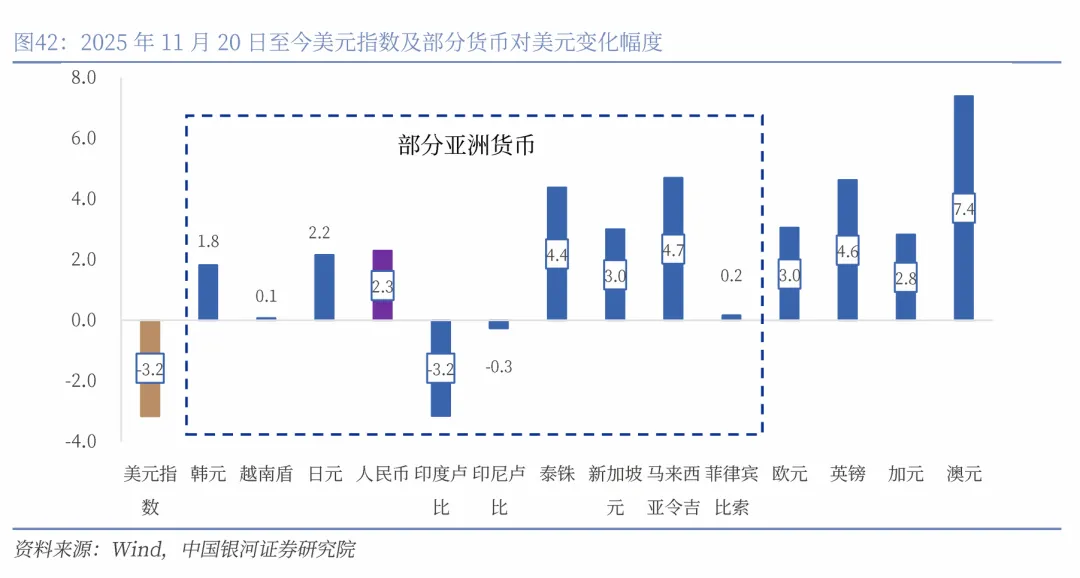 其一,市场进入“弱美元”交易,11月末至今美元指数从100.22下跌至97.05,跌幅近3.2%。非美货币普遍呈现升值。期间人民币对美元升值2.3%,在亚洲货币中表现较好,强于日元、韩元、越南盾、印度卢比、印尼卢比和菲律宾比索。这也意味着12月和1月来自季节性的因素支持人民币强于多数亚洲货币。