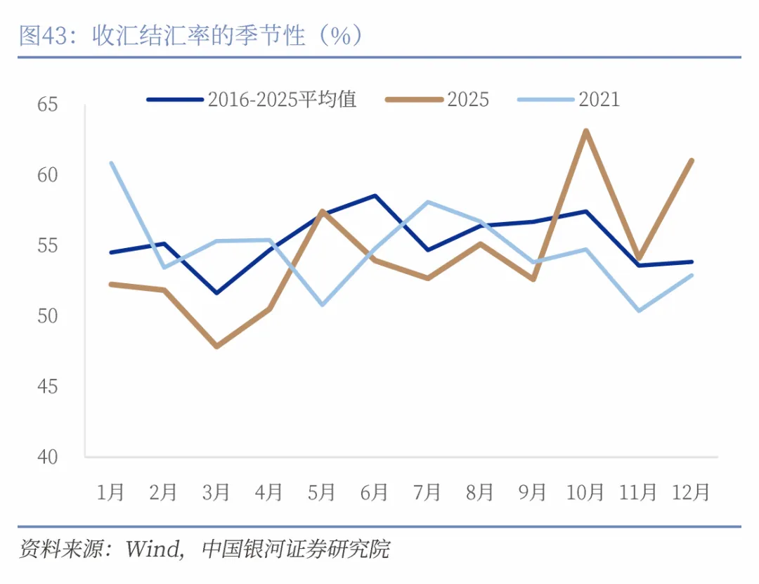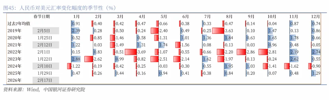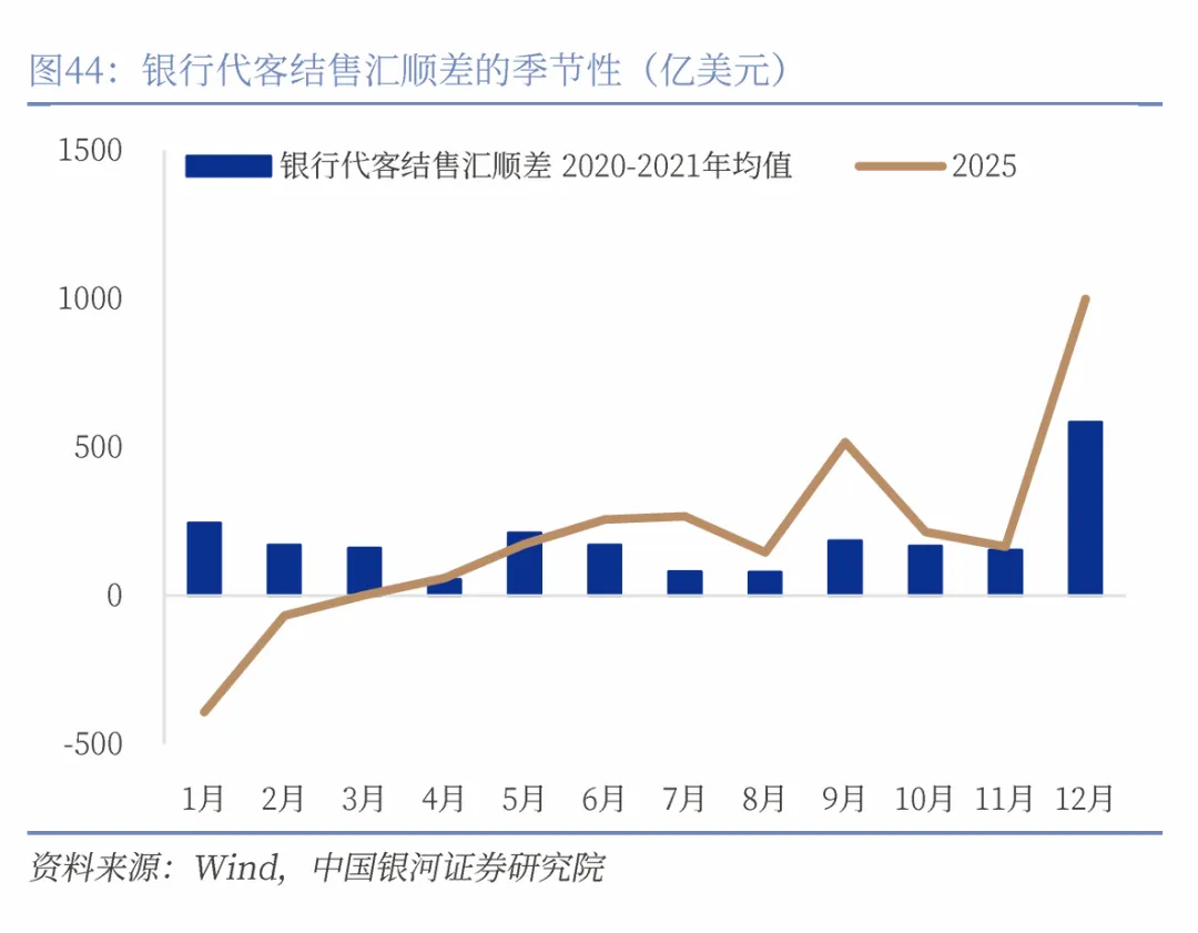 其二,从内部来看,年末人民币结汇需求通常季节性走强,叠加较强的升值预期,2025年年末的结汇需求显著强于季节性,12月银行代客结售汇顺差达999亿美元创历史新高,外汇供求关系有利于人民币走强。观察过去7年中人民币对美元的变化幅度数据,呈现明显的季节性,1月、11月和12月通常表现较为强势,呈现升值。人民币汇率7年中有6次在1月份、11月份均呈现升值,平均涨幅分别为0.91%和0.87%;人民币汇率7年中有5次人民币汇率在12月升值,平均涨幅为0.74%。2025年11月和12月两个月累计升值幅度高于过去6年的历史均值。
