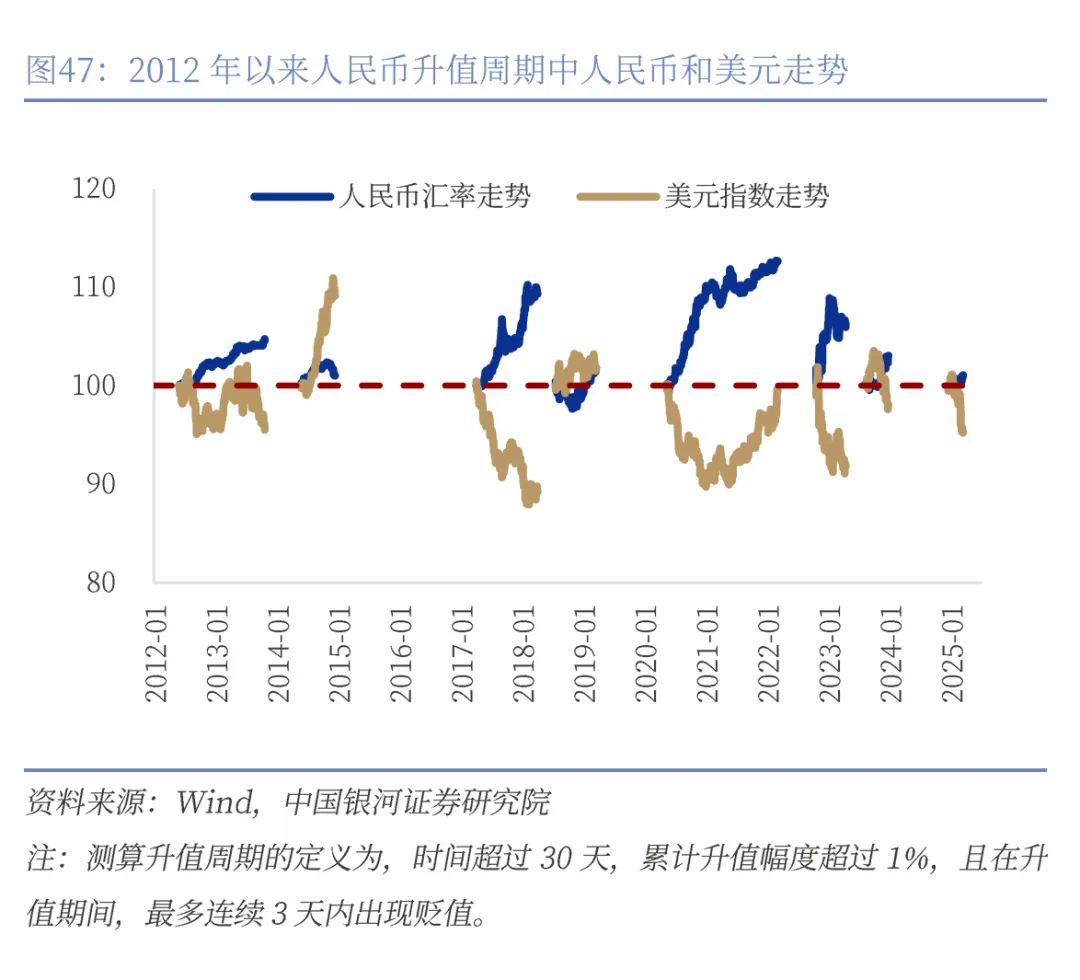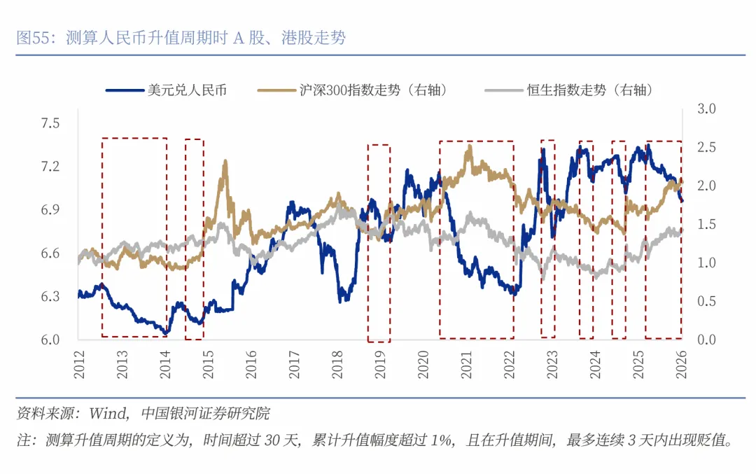 回顾2012年以来的多个人民币升值周期,不论其背后是由中国经济基本面走强所驱动,还是由国际资本流动和美元弱势主导,人民币升值几乎都伴随着市场风险偏好的改善,不论是A股还是港股都表现良好。相对而言,对外资更敏感、估值更受全球流动性影响的港股市场更受益。