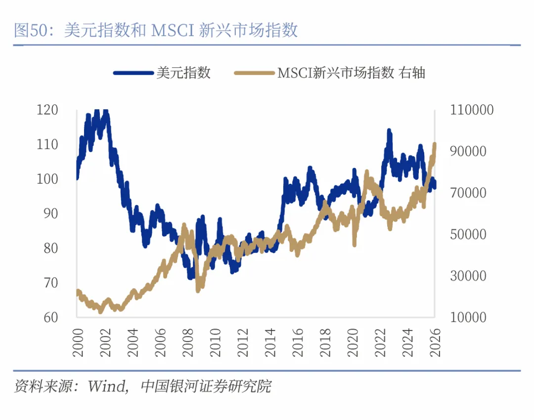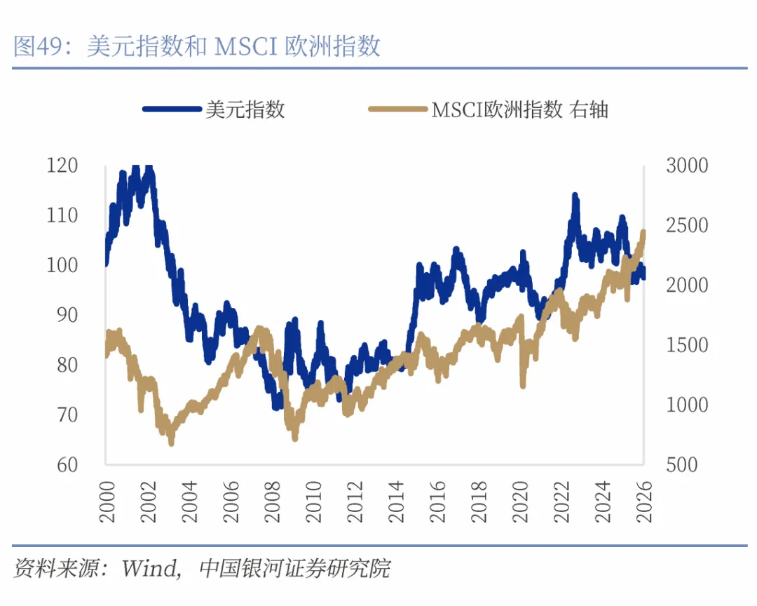 在全球视角下,人民币升值对应美元走弱,通常利好非美市场尤其是新兴市场股市。美元贬值意味着全球流动性环境宽松,资本更倾向于流向收益相对更高、增长前景更强的经济体,推升其股市估值。通过MSCI欧洲指数和新兴市场指数来看,新兴市场股市上行和弱美元的关联性更强。