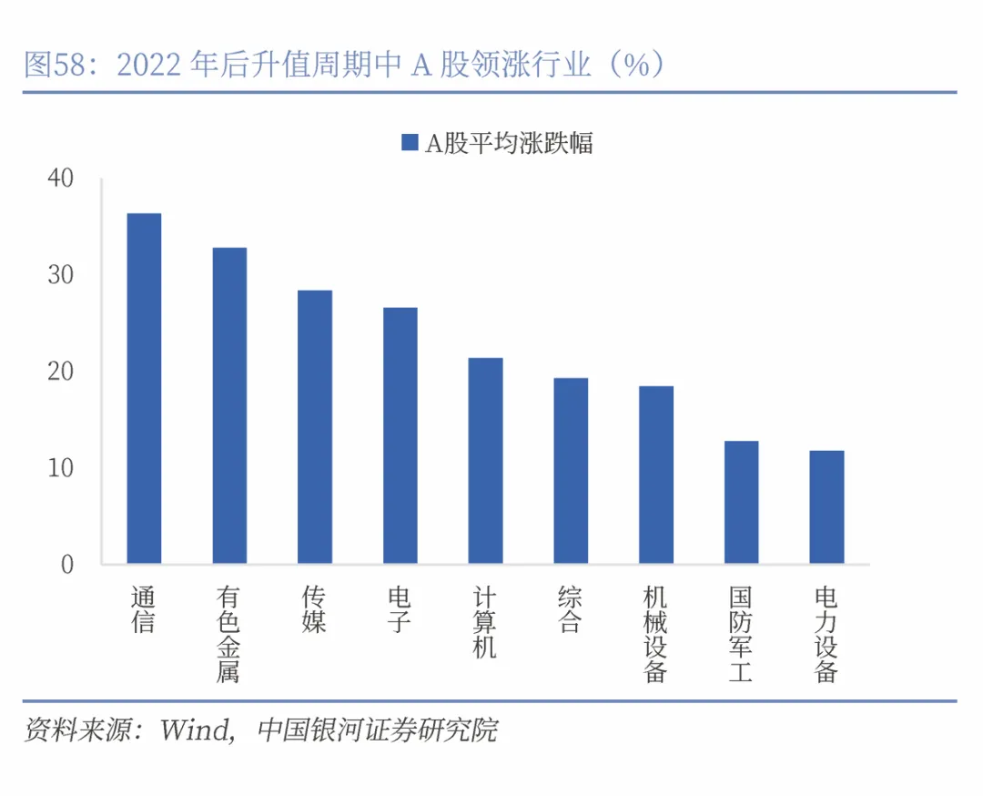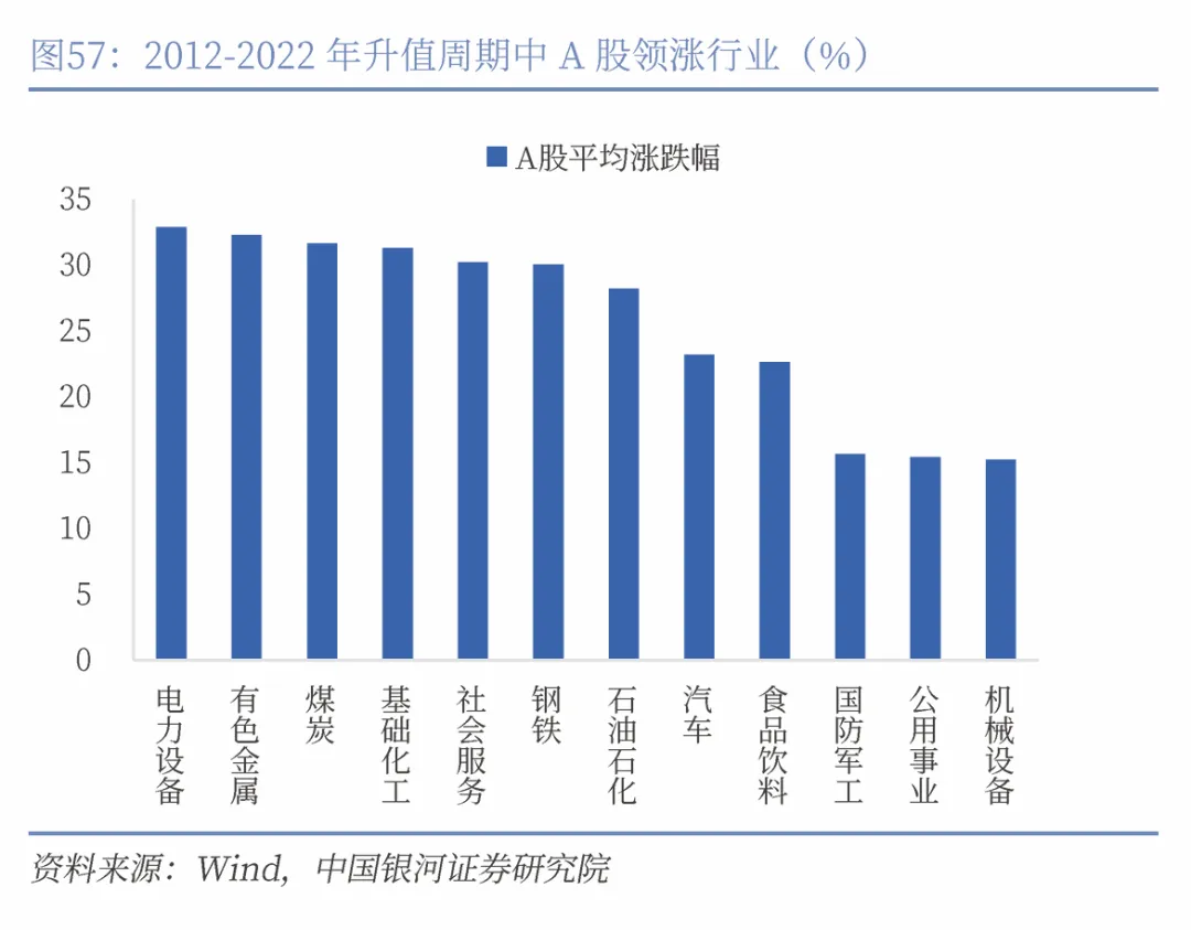 而升值周期中的A股投资者更关注国内政策预期和产业发展趋势,体现出政策导向与产业结构升级的主线逻辑。2022年以前的升值周期中,传统周期类行业如电力、有色金属、煤炭、化工、钢铁等板块普遍领涨;而2022年后的升值周期中,市场预期和资金配置明显向通信、半导体、新能源等代表高端制造和新质生产力的行业倾斜。