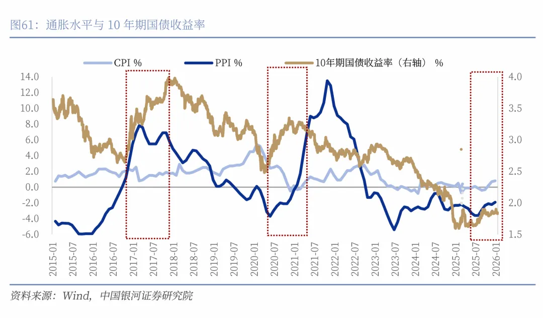 与过去两轮人民币升值周期相比,本轮通胀的上行压力有限。我们计算历次PPI触底回升力度发现,之前的两轮人民币升值周期,PPI都处于触底回升的阶段,通胀水平上行,推升长债收益率走高。本轮升值周期,PPI在2023年6月触底,但是回升力度偏弱,虽然2026年上半年通胀有望温和上行,但上行幅度较为有限。这将是本轮长债不会出现年度级别调整的重要因素之一。