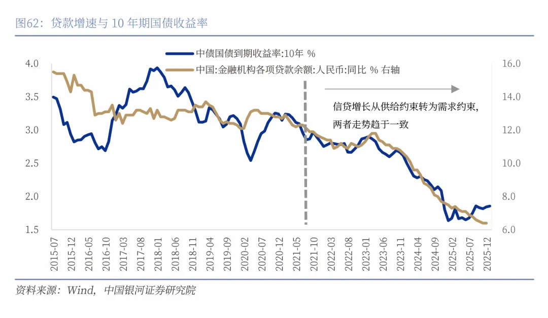 信贷增速面临需求约束。2021年中国开启房地产下行周期,信贷增长从供给约束转为需求约束,信贷增速下行。10年期国债收益率与贷款增速走势趋同,而本轮升值周期可能不会伴随信贷增速的强势回升。