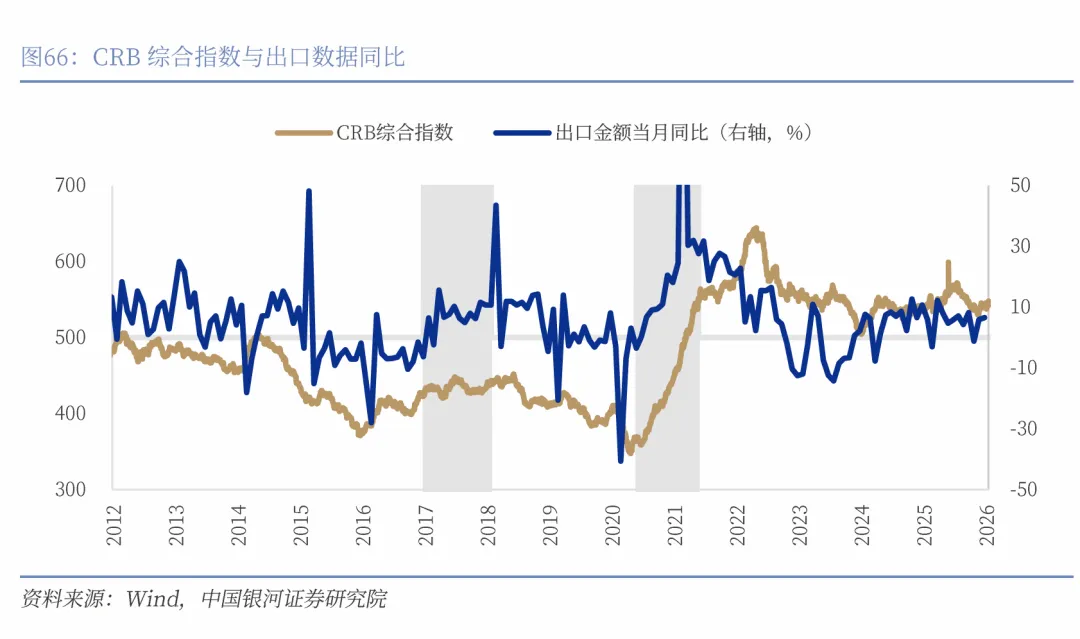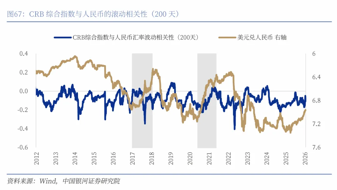 整体来看,人民币汇率的波动与国内大宗商品价格呈现一定程度的正相关性,而与国际大宗商品价格则表现出负相关性。一方面,人民币升值通常伴随中国经济预期改善、出口强劲、资本流入等信号,国内流动性边际宽松叠加内需回升,推动国内大宗商品价格上涨。另一方面,人民币升值阶段往往对应美元走弱,虽然理论上对国际商品价格形成支撑,但若该阶段全球经济处于下行周期或美元流动性主导逻辑减弱,国际大宗商品涨势反而受限,从而出现人民币升值与CRB指数弱负相关的现象。